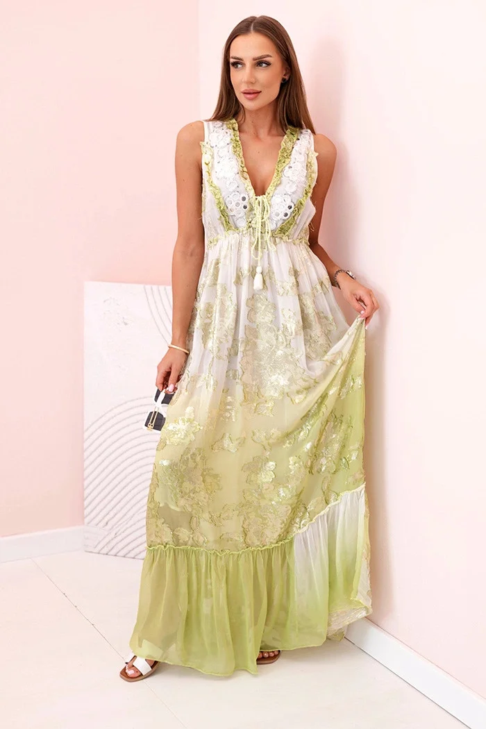 Pokud hledáte ideální šaty na letní dny, tyto dámské maxi šaty s výšivkou a hlubokým výstřihem jsou skvělou volbou. Lehký střih z viskózy krásně sedí na postavě a poskytuje maximální pohodlí i během horkých dnů. Vyšívané detaily na výstřihu dodávají šatům boho charakter a elastický pas zdůrazňuje ženskou postavu. Tento model je ideální na dovolenou, procházky po pláži nebo letní párty. Díky jedinečnému designu s módními romantickými prvky upoutá pozornost a dodá každému outfitu lehkost. Velikost je univerzální a vhodná pro ženy ve velikostech S, M nebo L. Vlastnosti produktu: Střih: maxi šaty, rozšířené směrem dolů Materiál: 100% viskóza – prodyšná a příjemná na dotek Pohodlí při nošení: elastický pas přizpůsobující se postavě Styl: boho, letní, romantický Výstřih: hluboký ve tvaru V, zdobený výšivkou a aplikacemi Ramínka: široká Doplňky: šňůrky pod prsy pro nastavení Vyrobeno v Indii Složení materiálu: 100% viskóza Rozměry uvedené níže jsou měřeny naplocho +/- 1 cm Pro získání obvodu vynásobíme šířku dvěma Rozměry: Šířka přes boky: 49 cm Šířka v pase: 34 cm (po natažení až 51 cm) Celková délka: 135 cm