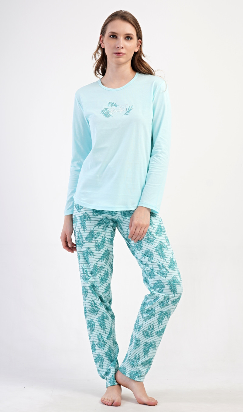 Dámské pyžamo dlouhé oblíbené značky Vienetta Secret. Dámské pyžamo se skládá z trika s dlouhým rukávem a dlouhých kalhot. Triko je jednobarevné, zdobené na hrudi drobným obrázkem větviček a nápis 'You are beautiful'. Motiv větviček se opakuje i na kalhotách, které mají v pase gumu a šňůrku na stažení, nemají kapsy. Použitý bavlněný materiál je poddajný a příjemný na dotek. 100% bavlna