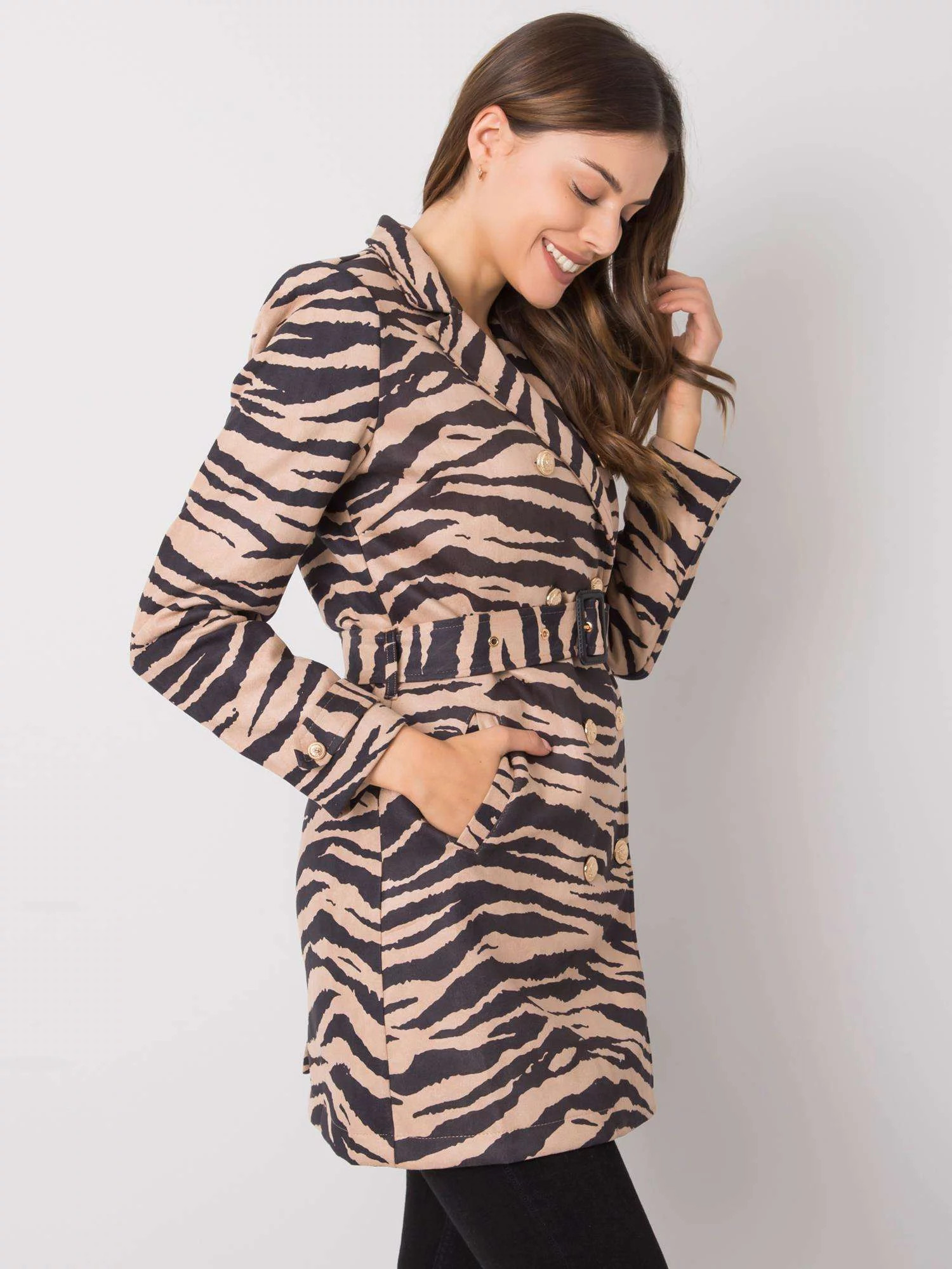 Béžovo-černý kabát se zvířecím motivem . Doplňky: všité ramenní vycpávky, opasek složení látky: 90 % polyester, 10 % spandex způsob praní: praní v pračce na 30 °C Modelka má na sobě velikost S. Rozměry modelky: výška 177 cm, poprsí 90 cm, pas 63 cm, boky 94 cm. Rozměry kabátu velikosti S měřené na plocho: šířka v podpaží - 47 cm, celková délka - 84 cm, délka rukávu - 60 cm Velikost Alt. Výška Obvod hrudníku hrudník Externí. délka. rukáv Vnitřní. délka rukávů S 36 160-164 82 59 49 M 38 162-172 86 61 51 L 40 164-174 91 63 53