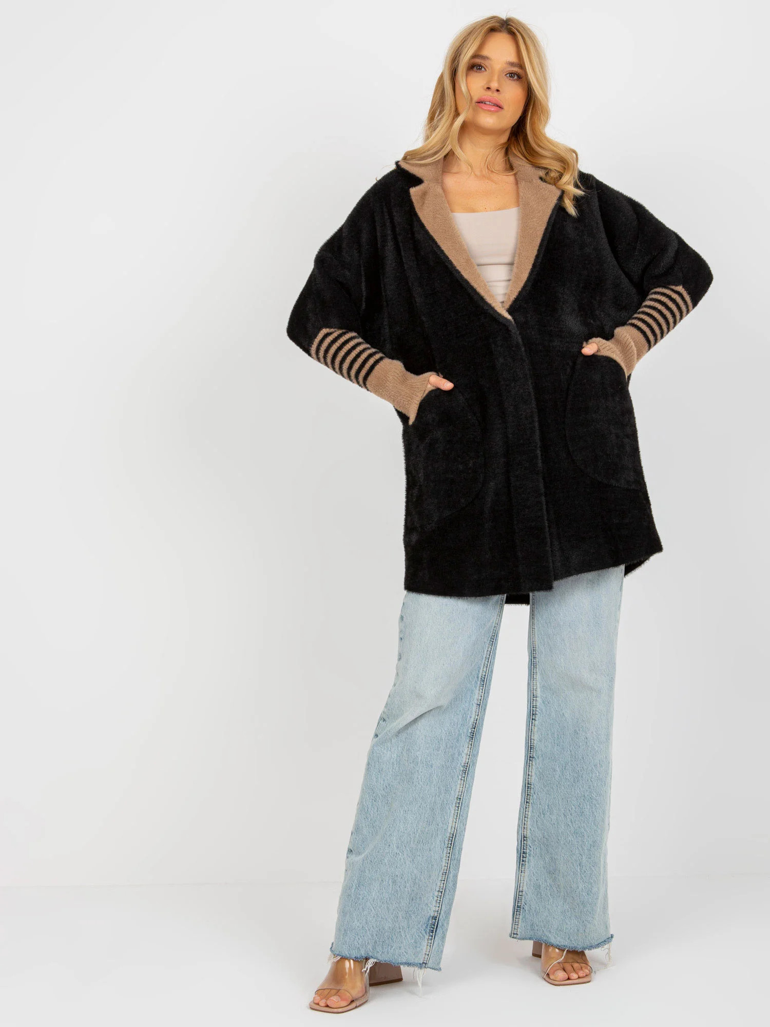 Černý volný kabát z alpaky s vlnou . Černý s hnědým límcem a pruhovanými rukávy s prodlouženou délkou. Kód produktu: MBM-PL-2001.95P dominantní vzor: hladký styl: ležérní příležitost: neformální, do práce, na procházku, do města Modelka má na sobě jednu velikost. míry modelky: výška 175 cm, prsa 84 cm, pas 65 cm, boky 92 cm. Rozměry kabátu v jedné velikosti měřené naplocho: šířka v podpaží - 67 cm, celková délka - 86 cm, délka rukávu - 57 cm.