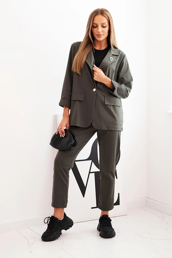 Elegantní dámský komplet skládající se z klasického saka a kalhot je skvělou volbou pro ženy, které chtějí spojit pohodlí s elegancí. Sako volného střihu, zapínané na knoflík, s klasickým límcem a praktickými kapsami, vypadá velmi stylově. Kalhoty s elastickým pasem a rovnou nohavicí zajišťují volnost pohybu a pohodlí po celý den. Díky použití vysoce kvalitní směsi bavlny, polyamidu a elastanu je komplet příjemný na dotek, prodyšný a zároveň mírně elastický. Ideální jak do práce, tak na schůzky či elegantní vycházky. Vhodné pro dámy nosící velikosti M,L,XL. Vlastnosti produktu: Dvoudílný komplet: sako + kalhoty Sako zapínané na knoflík s klasickým límcem Praktické kapsy v saku Kalhoty s elastickým pasem Rovná nohavice Měkká, prodyšná a elastická tkanina Výroba v Itálii Rozměry uvedené níže jsou měřeny na plocho +/- 1 cmPro získání rozměru obvodu šířku násobíme 2 Rozměry Saka: Šířka pod pažemi: 57 cm (po roztažení: 62 cm) – Hrudník od cca 114 do 124 cm Celková délka: 73 cm Délka rukávu od paže: 41 cm Rozměry Kalhot: Šířka v pase: 35 cm (po roztažení: 45 cm) Šířka v bocích: 50 cm (po roztažení: 55 cm) Celková délka: 93 cm Délka nohavice od rozkroku: 64 cm Složení materiálu: 55% Bavlna 37,5% Polyamid 7,5% Elastan