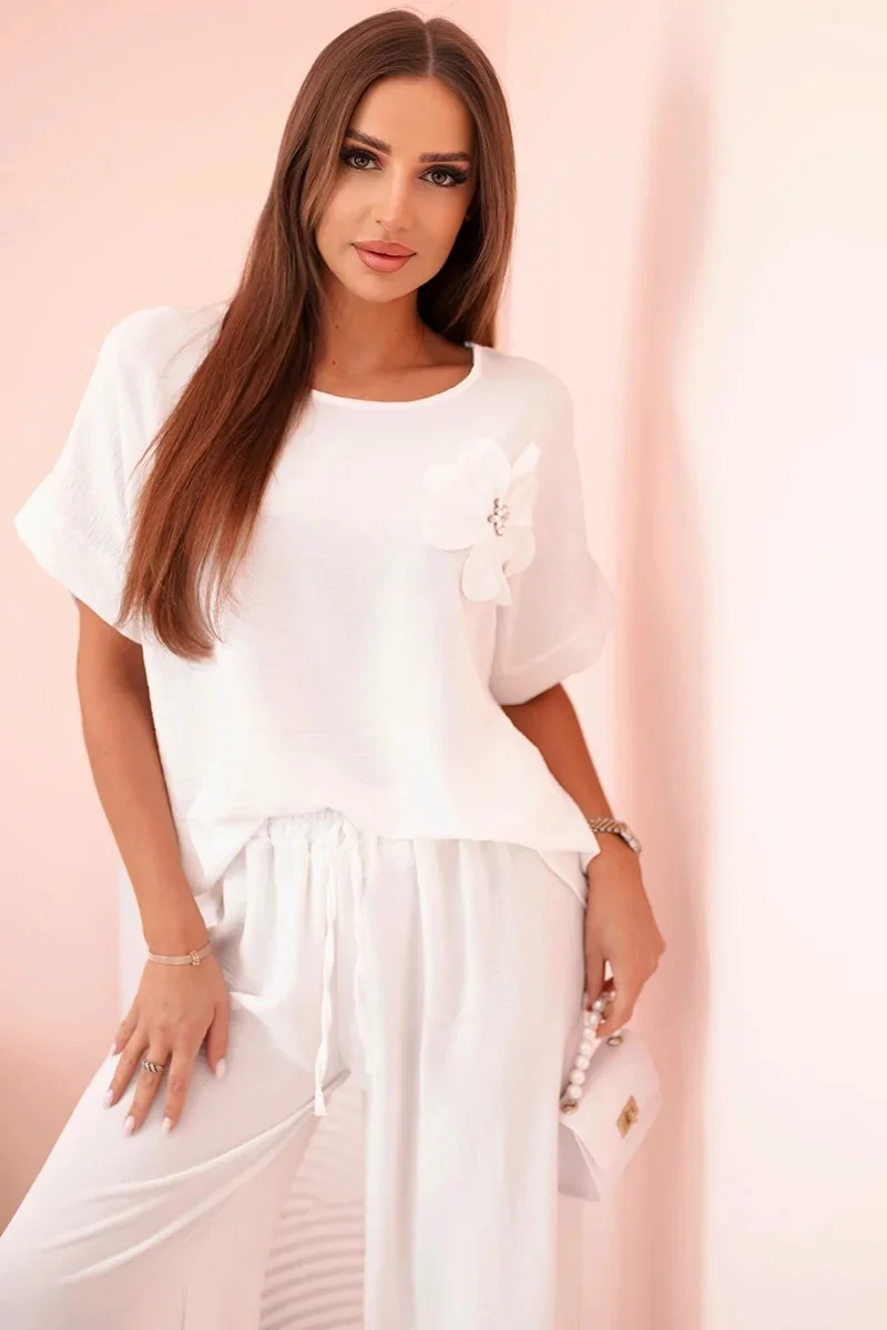 Dámský komplet z viskózy s ozdobným květem a širokými kalhotami - fuchsie bílý UNI