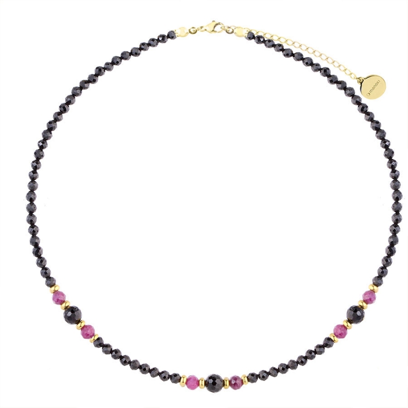 Představujeme vám exkluzivní náhrdelník, který kombinuje hloubku broušených černých turmalínů s jemností růžových rubínů. Tento jedinečný náhrdelník byl navržen pro ženy, které oceňují luxus a styl. Růžové rubíny dodávají náhrdelníku ušlechtilý nádech a vytvářejí sofistikovaný kontrast s černými turmalíny. Prvotřídní pozlacená povrchová úprava z nerezové oceli dodává náhrdelníku luxusní vzhled a zároveň zajišťuje trvanlivost a odolnost. Tento náhrdelník není jen módním doplňkem, ale také šperkem s významem. Turmalín je kámen, který se tradičně pojí s ochranou a vyrovnaností, zatímco rubín symbolizuje vášeň a lásku. Tento náhrdelník je ideální pro ženy, které chtějí vyjádřit svou osobnost a zároveň ocenit kvalitu a krásu přírodních materiálů. Je vhodný jak pro každodenní nošení, tak pro speciální příležitosti, kde chce žena zažářit a přitom si zachovat kousek přírody blízko srdce.