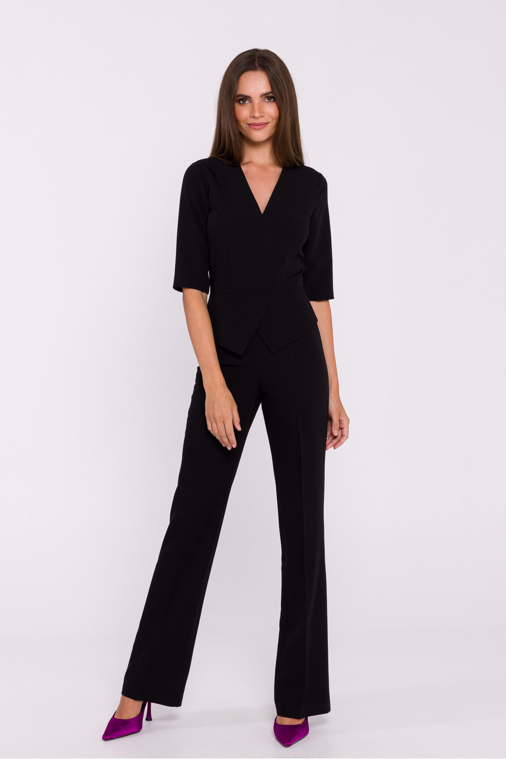 Elegantní tkaný overal s kosticí v pase, která zvýrazňuje pas a dodává mu ženský nádech. Výstřih do V dodává elegantní nádech, zatímco krátké rukávy dodávají lehkost. Zkrácené a rozšířené nohavice opticky prodlužují siluetu a vytvářejí moderní a stylový vzhled. Oblek se zapíná na skrytý zip na zádech a je bez podšívky pro pohodlné nošení. Pečlivě navržený a ušitý v Polsku je ideální volbou pro ženy, které hledají módní alternativu ke klasickým šatům. Elastan 5 % Polyester 65 % Viskóza 30 % Velikost DélkaObvod beder Obvod prsou Obvod v pase L160 cm106 cm96 cm82 cmM159.5 cm101 cm91 cm77 cmS159 cm96 cm86 cm72 cmXL160.5 cm111 cm101 cm85 cmXXL161 cm116 cm106 cm92 cm