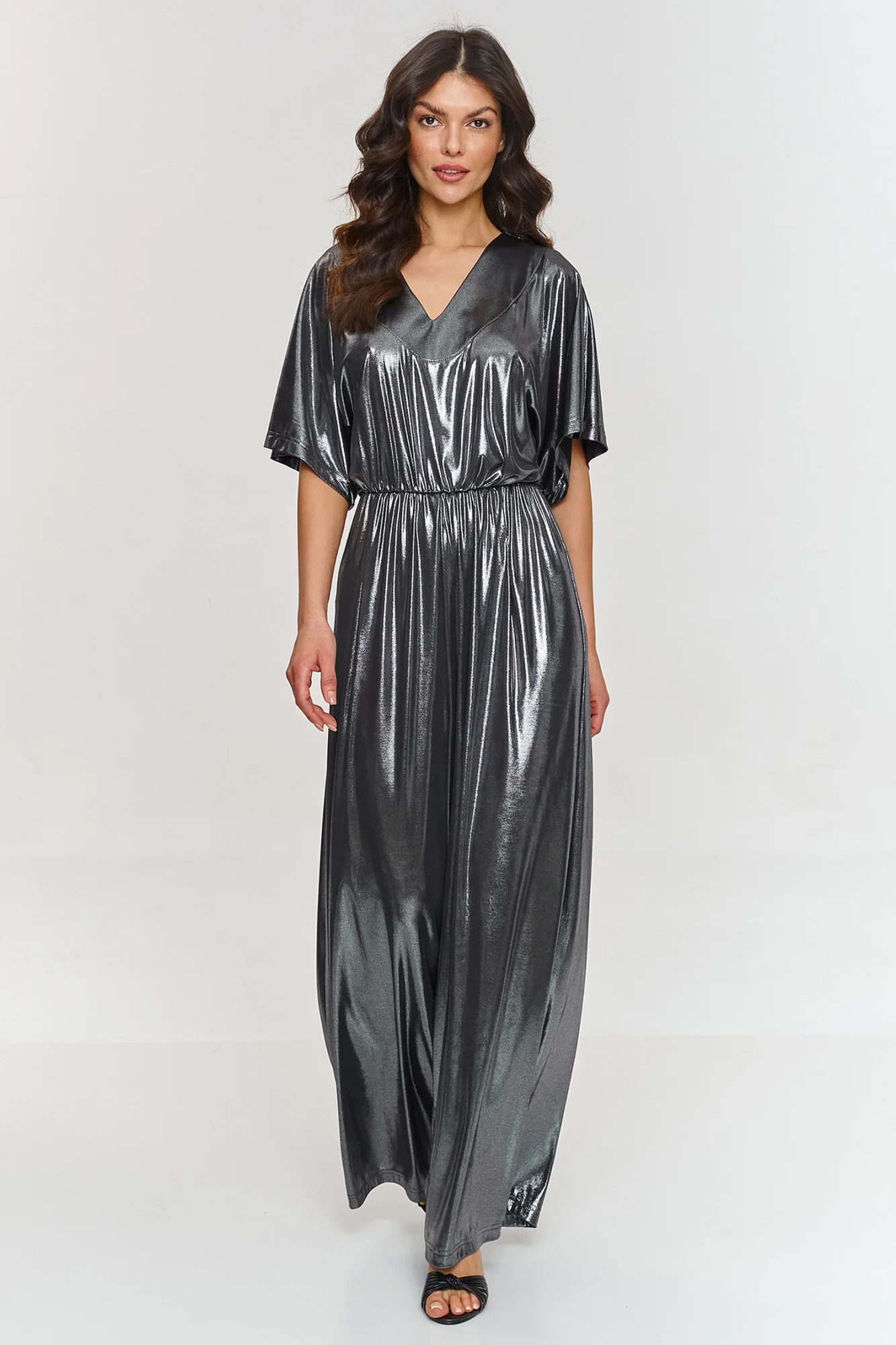 Tento overal je kombinací elegance a pohodlí, která jistě přitáhne pozornost na každé speciální události. Volný vrch s rukávy v kimono stylu mu dodává lehkosti a volnosti. Tento detail dělá outfit vypadat výjimečně a stylově, zároveň neomezujíc pohyb. Výstřih do srdce je decentní a elegantní, skvěle zdůrazňuje krk a ramena. Tento střih výstřihu přidává smyslnost a zdůrazňuje ženskou siluetu, zachovávajíce přitom klasický, elegantní vzhled. Široké nohavice dávají overalu lehkost a zároveň zakrývají nedokonalosti postavy a umožní prodloužit siluetu. Elastický pas v pasu zaručuje přizpůsobení a zdůraznění figury, vytvářejíc efekt vydřeného pasu. Díky tomu se overal nejen stylově, ale i pohodlně prezentuje po celý den nebo večer. Model je vyroben z jemného materiálu s kovovým zpracováním, dodávající outfitu výjimečný lesk a moderní charakter. Overal v kovové barvě s výstřihem do srdce je návrh, který tě vystaví z davu. Jeho moderní střih a lesklý materiál ti zajistí pocit jistoty a stylu na každé party. Jedná se o skvělou alternativu k šatům, zaručující pohodlí a výjimečný vzhled. Elastan 7 % Polyester 93 % Velikost DélkaObvod beder Obvod prsou Obvod v pase 36150 cm104 cm104 cm96 cm38152 cm108 cm108 cm100 cm40154 cm112 cm112 cm104 cm42156 cm116 cm116 cm108 cm