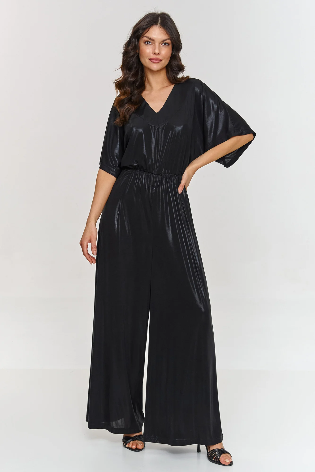 Tento overal je kombinací elegance a pohodlí, která jistě přitáhne pozornost na každé speciální události. Volný vrch s kimono rukávy dodává lehkost a volnost. Tento detail dělá outfit vypadat výjimečně a stylově, zároveň neomezuje pohyb. Výstřih do "V" je decentní a elegantní, skvěle zdůrazňuje krk a ramena. Tento střih výstřihu přidává smyslnost a zdůrazňuje ženskou siluetu, zachovává přitom klasický a elegantní vzhled. Široké nohavice dodávají overalu lehkost a zároveň zakrývají nedokonalosti postavy a umožní prodloužit siluetu. Elastický pas v pasu zaručuje přizpůsobení a zdůraznění postavy, vytváří efekt přesýpacích hodin. Díky tomu se overal nejen stylově, ale i pohodlně prezentuje po celý den či večer. Model je vyroben z jemného materiálu s metalickým povrchem, který outfitu dodává výjimečný lesk a moderní charakter. Overal v metalické barvě s výstřihem do "V" je návrh, který vás vynese z davu. Jeho moderní střih a lesklý materiál vám zajistí sebedůvěru a styl na každé party. Je to skvělá alternativa k šatům, zaručující pohodlí a výjimečný vzhled. Elastan 7 % Polyester 93 % Velikost DélkaObvod beder Obvod prsou Obvod v pase 36150 cm104 cm104 cm96 cm38152 cm108 cm108 cm100 cm40154 cm112 cm112 cm104 cm42156 cm116 cm116 cm108 cm