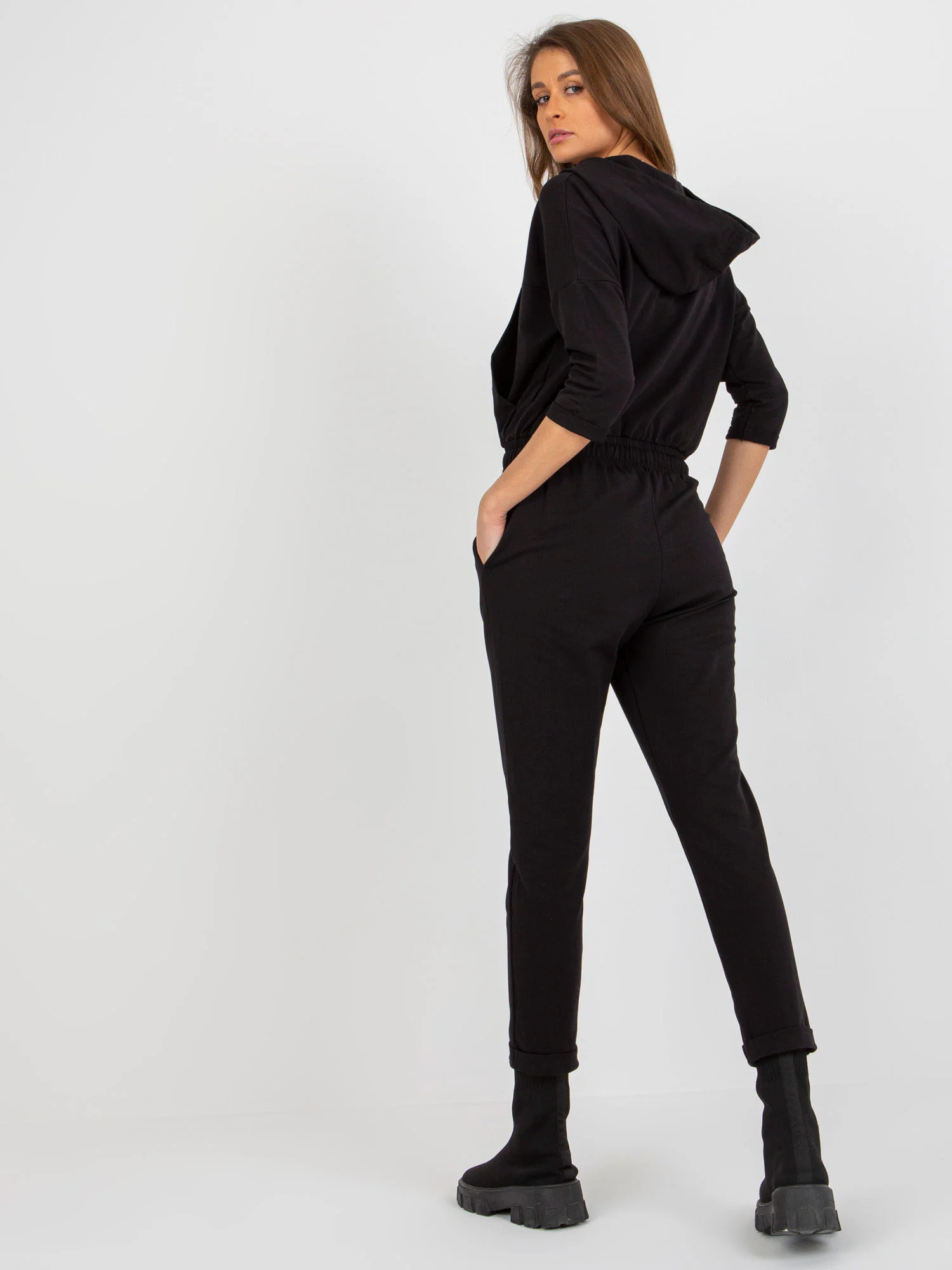 Černá tepláková souprava s kalhotami a kapsami . kód produktu: RV-KO-7824.04 dominantní vzor: hladký styl: ležérní příležitost: neformální, město, procházky Modelka má na sobě velikost S/M. Rozměry modelky: výška 176 cm, poprsí 85 cm, pas 64 cm, boky 92 cm Rozměry obleku ve velikosti S/M měřené na plocho: šířka v podpaží - 55 cm, délka rukávu - 41 cm, celková délka - 137 cm.Velikost Alt.VýškaObvod hrudníku hrudníkExterní. délka. rukávVnitřní. délka rukávůS/M36/38160-17282-8659-6149-51L/XL40/42164-17891-9663-6553-55