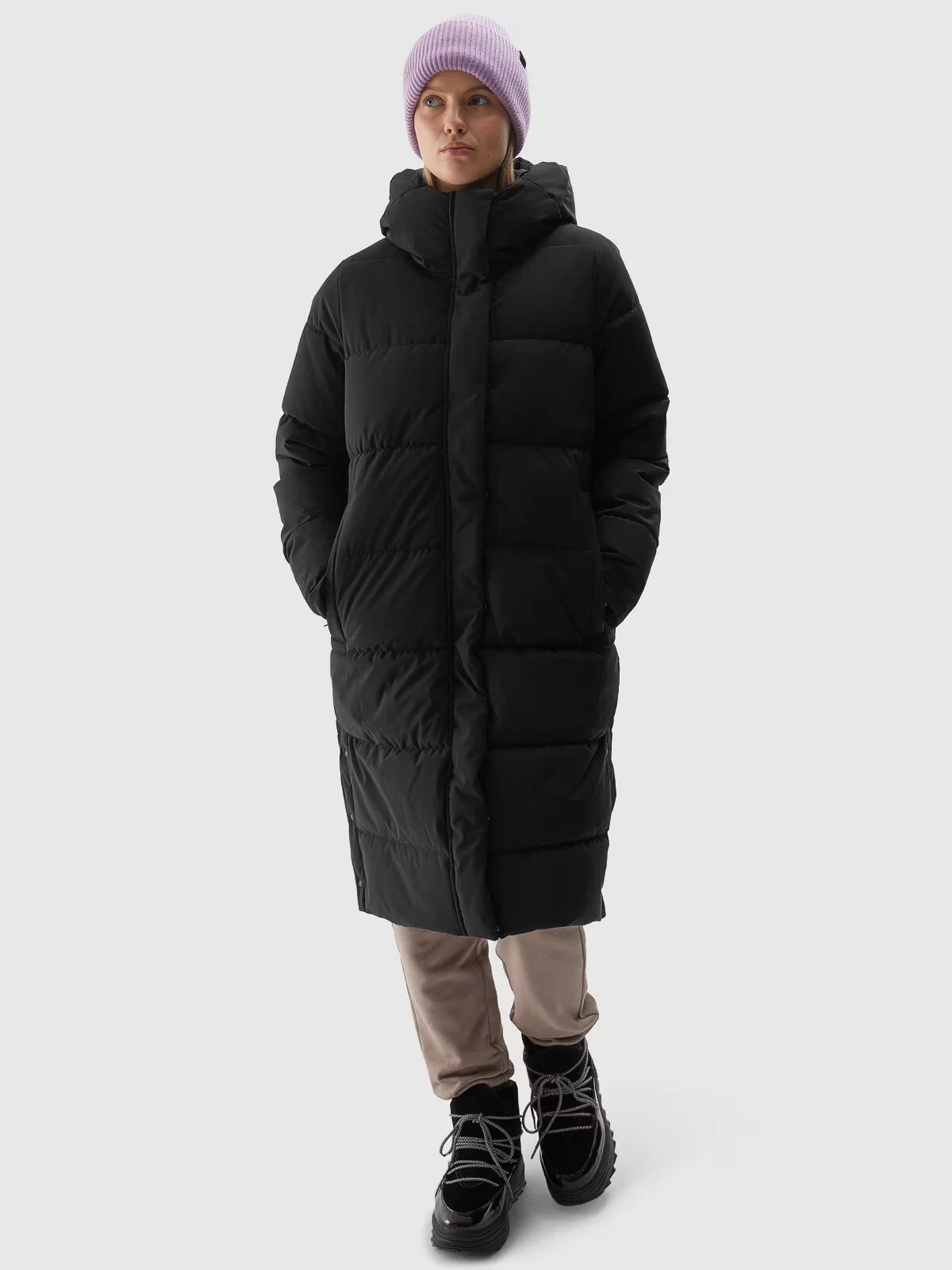 Dámský zimní péřový kabát se zvýšeným objemem a hmotností výplně je ideální volbou pro chladné a zimní dny při každodenních nebo sportovních aktivitách. Zaručuje velmi dobrou ochranu při nízkých teplotách a zároveň plný komfort během různých povětrnostních podmínek. Bunda má klasické horizontální prošívání, které se skládá z rovnoběžných pruhů vedoucích napříč bundou. Tento druh prošívání zajišťuje dobrou tepelnou izolaci a dostatečnou kompresi bundy. Má střih regular, který se pohodlně přizpůsobí postavě, a délku sahající pod kolena pro větší ochranu před chladem.
