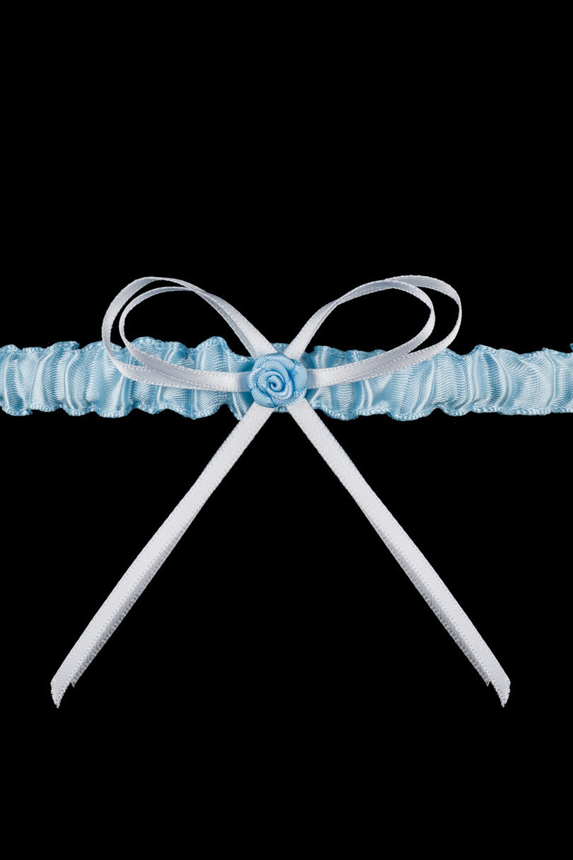 Světle modrý dámský podvazek ze saténu. Podvazek je ozdobený mašličkou s lesklým kamínkem - křišťálkem.