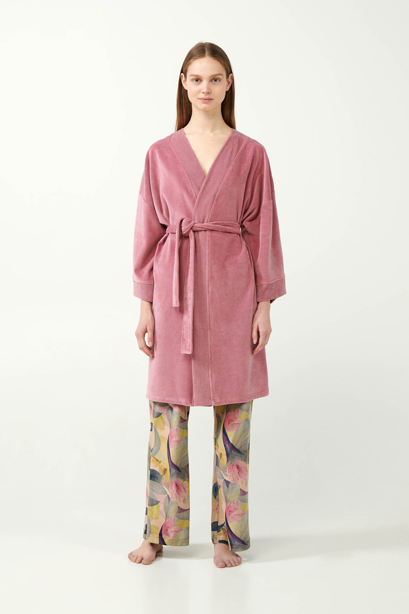 80% Bavlna + 20% Polyester Délka: 100 cm. Modelka: výška 175 cm, velikost: Small. Zabalte se do luxusu s tímto dámským županem, který je vyroben z mimořádně jemného sametu bohatého na bavlnu. Župan má klasický zkřížený design, který umožňuje přizpůsobit si střih pomocí odpovídajícího pásku. Žebrovaný klopový lem dodává eleganci a povyšuje tento útulný základní kousek. Tento župan je ideální pro stylové lenošení, nabízí pohodlí i sofistikovanost a je ideální volbou pro domácí relaxaci. Dopřejte si teplo a měkkost, a přitom vypadejte bez námahy elegantně.