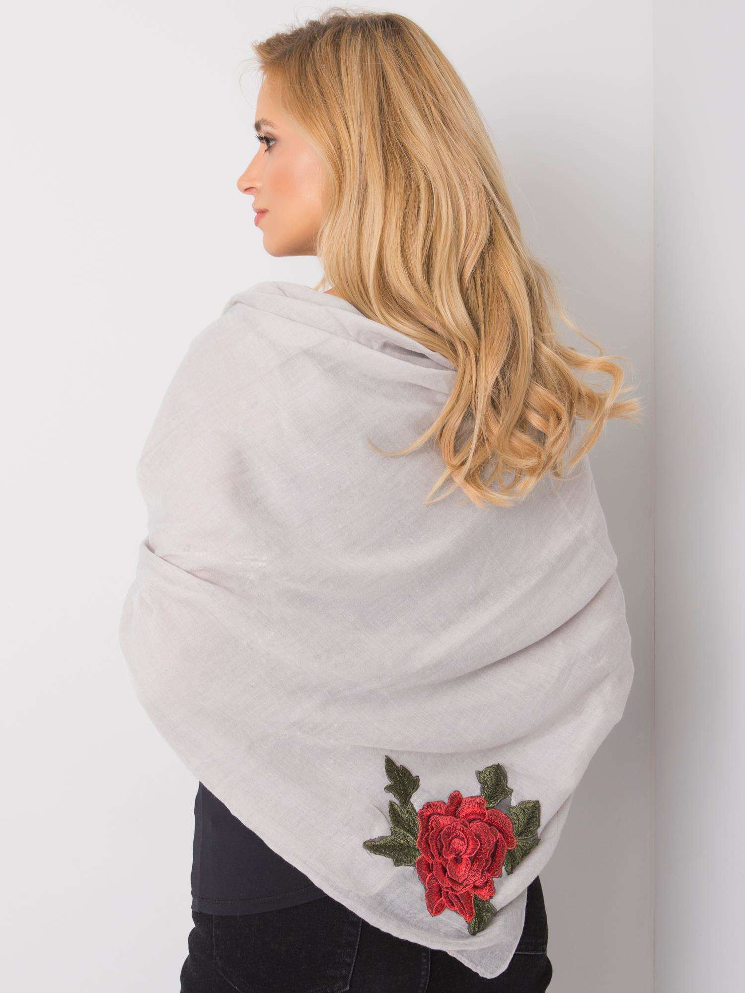 Šedá dámská šála s nášivkami. složení látky: 30 % bavlna, 70 % viskóza způsob praní: praní v pračce na 30 °C rozměry: přibližně 120 x 120 cm