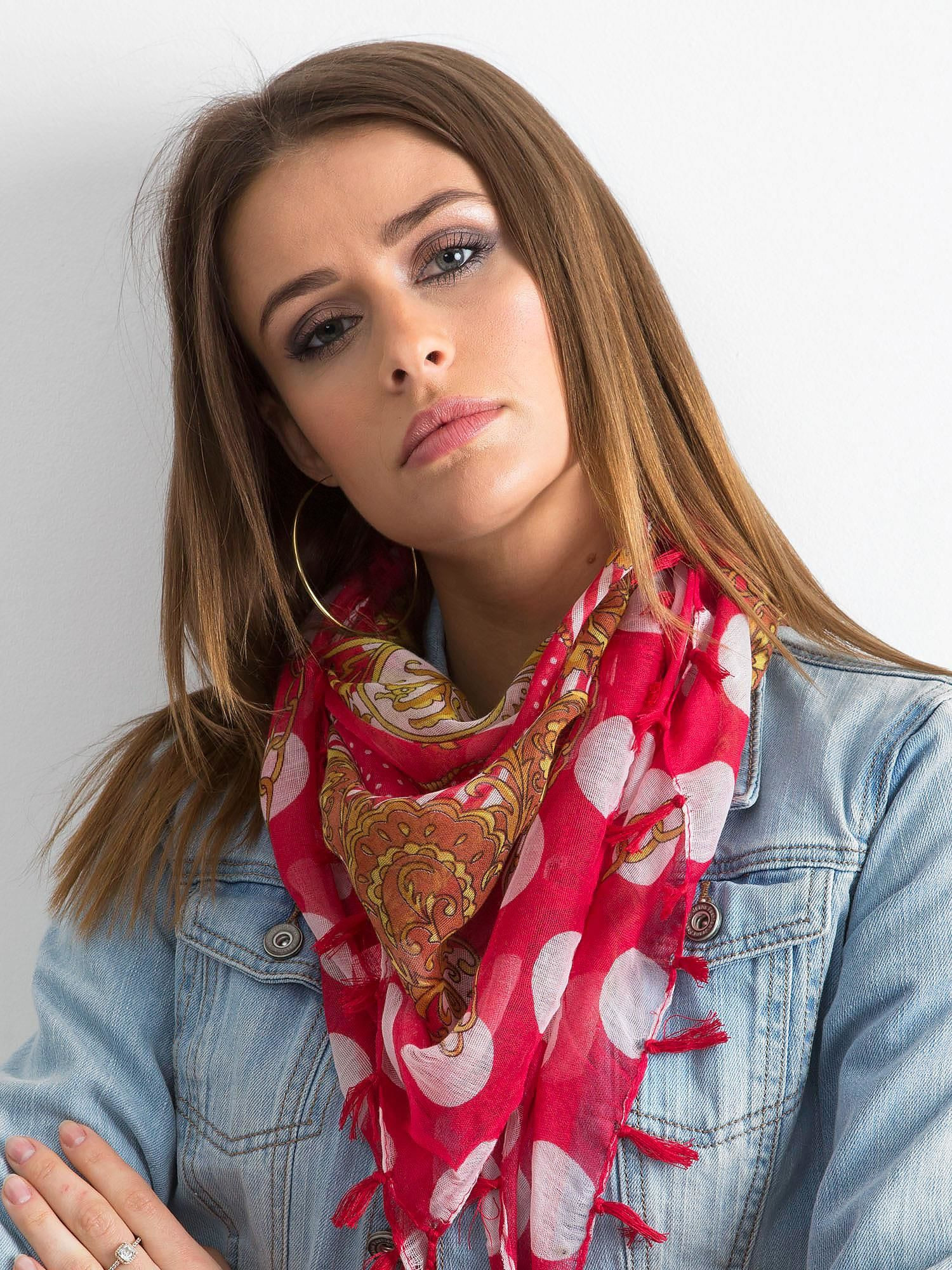 Vzorovaná červená šála. příslušenství: střapce složení látky: 100% viskóza způsob praní: praní v pračce na 30 °C Rozměry: přibližně. 100 x 100 cm