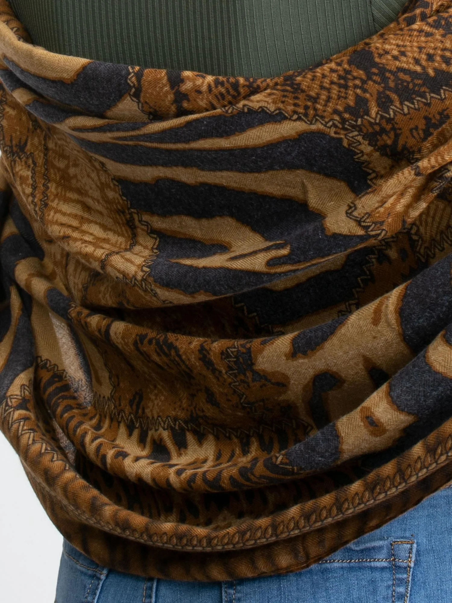 Sling se zvířecím vzorem ve světle hnědé barvě. materiálové složení: 100% viskóza způsob praní: ruční praní rozměry: přibližně 180 x 100 cm