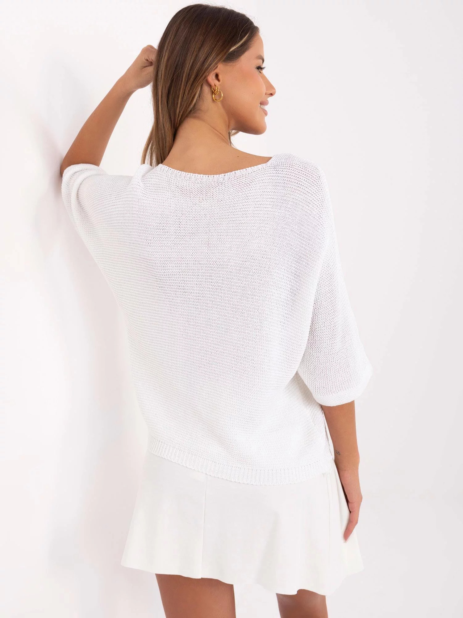 Dámský pletený svetr s véčkovým výstřihem. Na prsou potisk Los Angeles California a medvídek. Modelka má na sobě jednu velikost. míry modelky: výška 176 cm, poprsí 90 cm, pas 62 cm, boky 94 cm. Rozměry svetru v jedné velikosti měřené na plocho: šířka v podpaží - 62 cm, délka rukávu - 25 cm (od podpaží), celková délka - 62 cm, šířka v bocích - 53 cm (na plocho), šířka v bocích - 65 cm (po natažení).