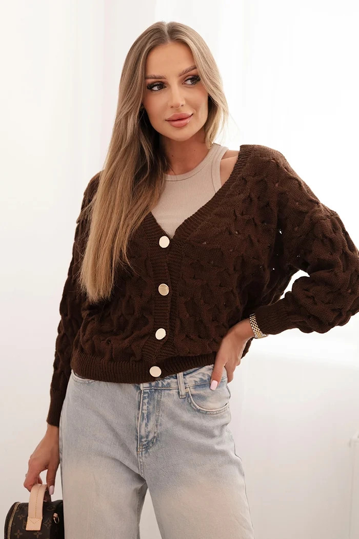 Tento roztomilý dámský svetr s ažurovým vzorem je ideální volbou pro ženy, které si cení elegance a pohodlí. Model se zapínáním na efektní zlaté knoflíky a hlubokým výstřihem do V mu dodává jemný půvab a ženský charakter. Volnější střih zajišťuje, že svetr krásně sedí na postavě, neomezuje v pohybu a hodí se jak k džínům, tak k sukním. Svetr bude skvělou volbou na chladnější dny – vezmete si ho do práce, na procházku, schůzku s přáteli nebo jako součást ležérního outfitu. Lehký a prodyšný ažurový materiál zajišťuje pohodlí po celý den. Velikost je univerzální a bude vhodná pro dámy velikosti S, M nebo L. Vlastnosti produktu: volný, pohodlný střih výstřih do V efektní ažurový vzor zapínání na zlaté knoflíky dlouhé rukávy zakončené manžetou pohodlný, měkký materiál Vyrobeno v Itálii Složení materiálu: 100 % Akryl Rozměry uvedené níže jsou měřeny naplocho +/- 1 cm Pro získání obvodu násobíme šířku x2 Rozměry: Šířka v podpaží: 52 cm Délka rukávu od podpaží: 40 cm Celková délka: 59 cm