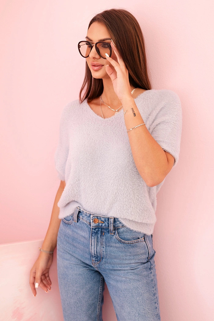 Dámský svetr z měkkého chlupu s výstřihem do V krátkým rukávem šedý UNI