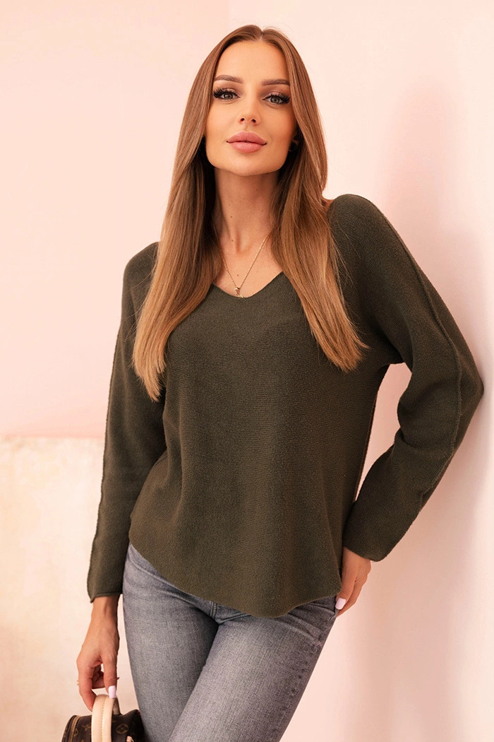 Dámský svetr z viskózy s výstřihem do V tmavě khaki UNI