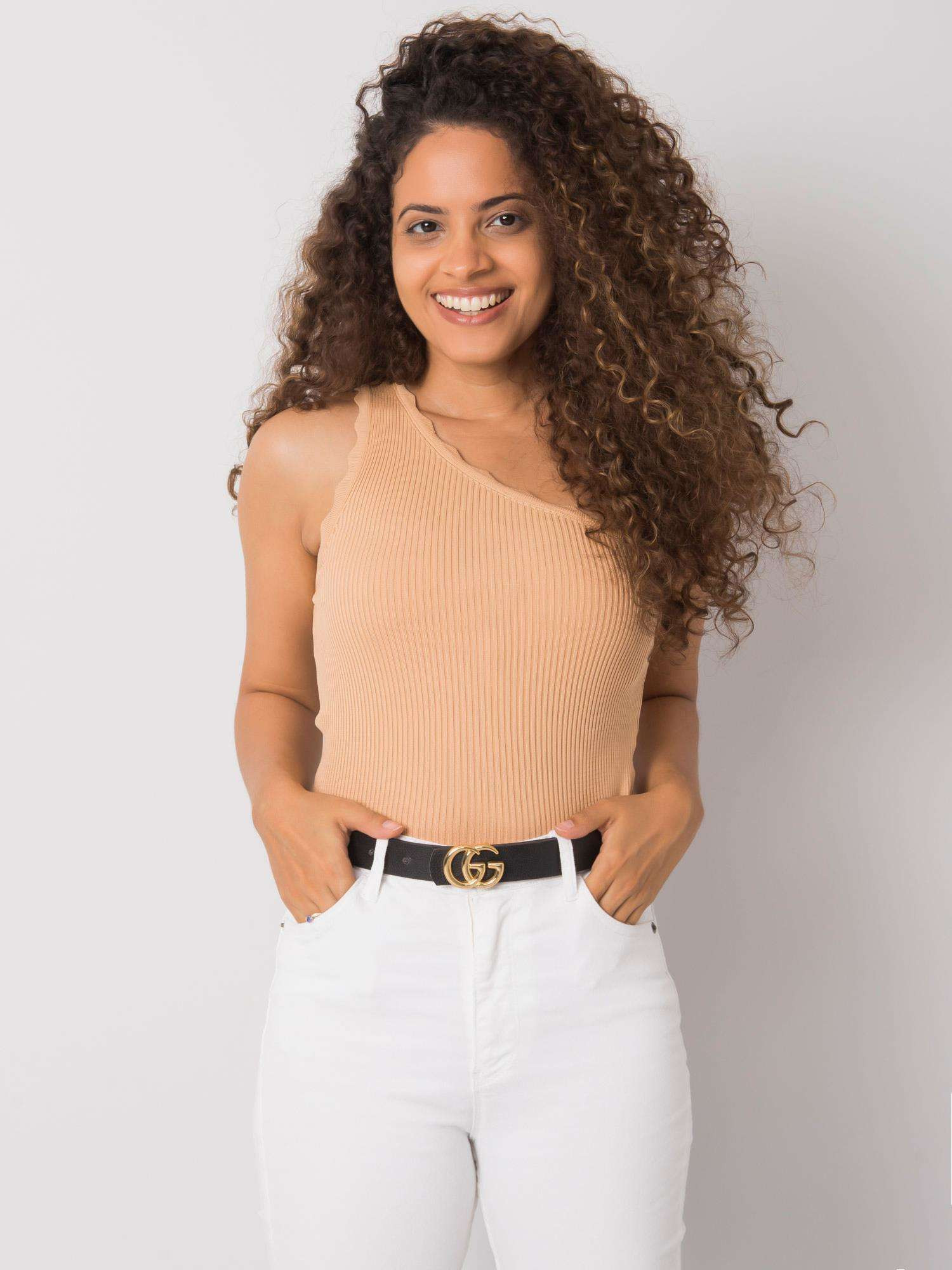 Velbloudí asymetrický top. typ tkaniny: žebrovaná složení tkaniny: 100% akryl způsob praní: praní v pračce na 30 °C Modelka má na sobě jednu velikost. Rozměry modelky: výška 164 cm, prsa 83 cm, pas 65 cm, boky 94 cm. Rozměry topu v jedné velikosti měřené na plocho: šířka v podpaží - 25 cm, celková délka - 45 cm