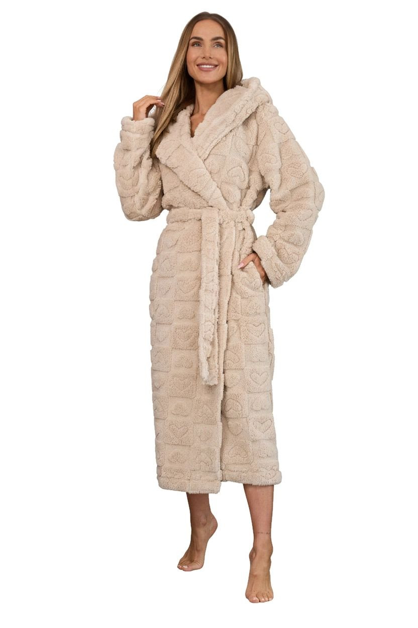 Dámský župan 2554 Valentine L&L - béžová barva - z měkkého materiálu typu soft - protlačený vzor ve tvaru srdíček - na bocích kapsy - zavazování v pase na pásek - s kapucí - dlouhýMateriálové složení: 100% polyester Dámské velikosti S/M L/XL Výška (cm) 164 170 Obvod přes prsa (cm) 96 96 Obvod přes boky (cm) 104 108 Pánské velikosti L XL Výška (cm) 176 182 Obvod přes prsa (cm) 114-116 118-120 Obvod přes boky (cm) 112 116
