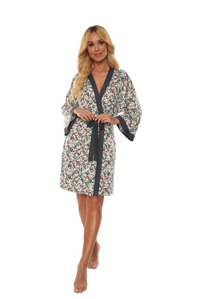 Tenký dámský župan s rukávy typu kimono. Ušitý z vzorované viskozy. V pase na zavázání. Na bocích pohodlné kapsy. Složení: 94% viskoza, 6% elastan.