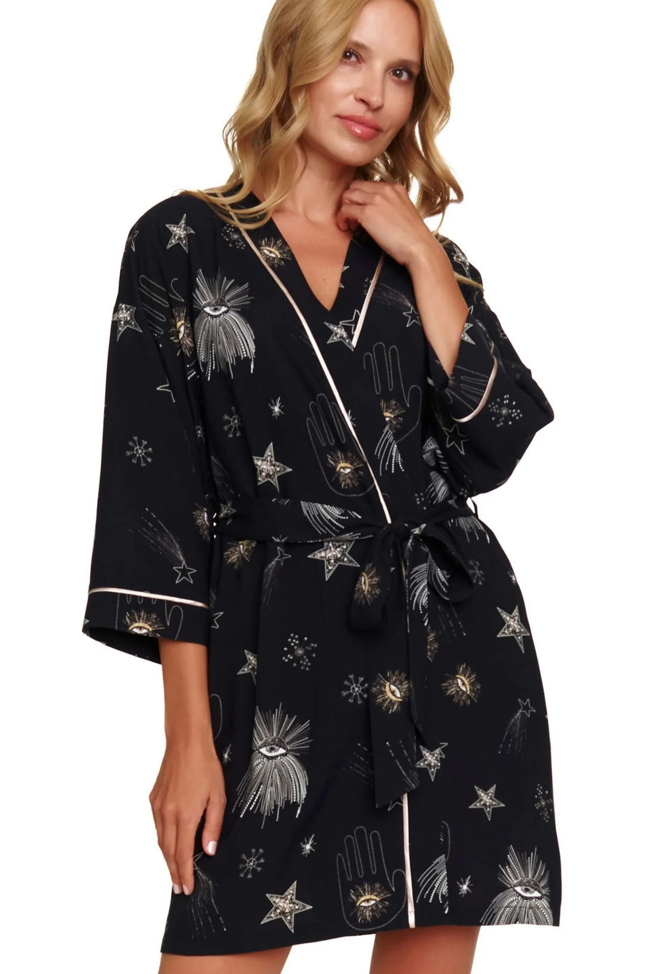 Dámský župan 7179 Doctornap - černá barva - z vysoce jakostní viskózy - se vzorem - tříčtvrteční rukávy - kimonový střih - s kapsami - zdobené efektním lemem - délka nad kolena - certifikát OEKO-TEX Standard 100Materiálové složení: 100% viskóza