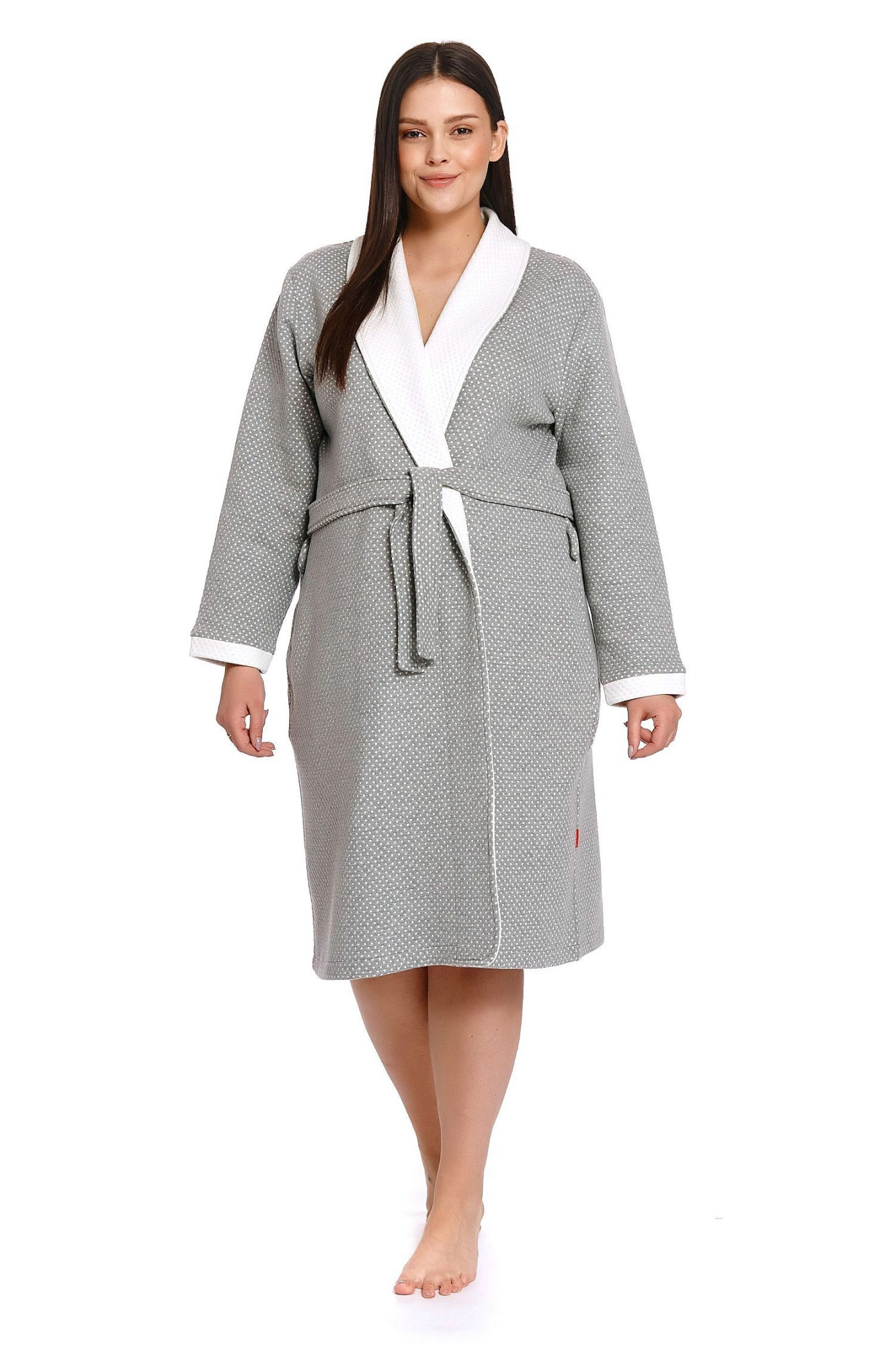 Dámský župan 9276 Doctornap - šedá barva - z vysoce jakostního žakárového úpletu - s puntíkatým vzorem - dlouhé rukávy - pohodlné kapsy - s šálovým límcem v bílé barvěMateriálové složení: 50% bavlna+ 50% polyester