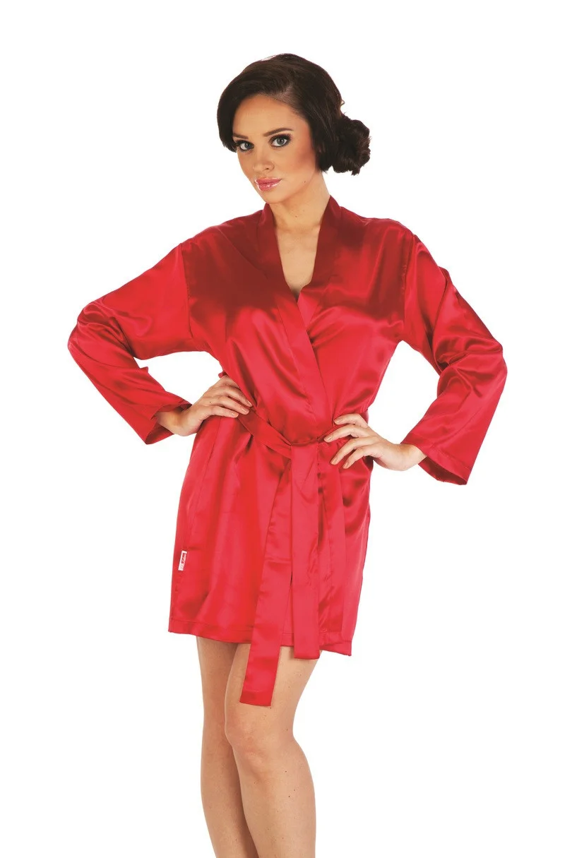 Krátký saténový župan, v Podvazkový páse na zavázání. 97% polyamid, 3% elastan.