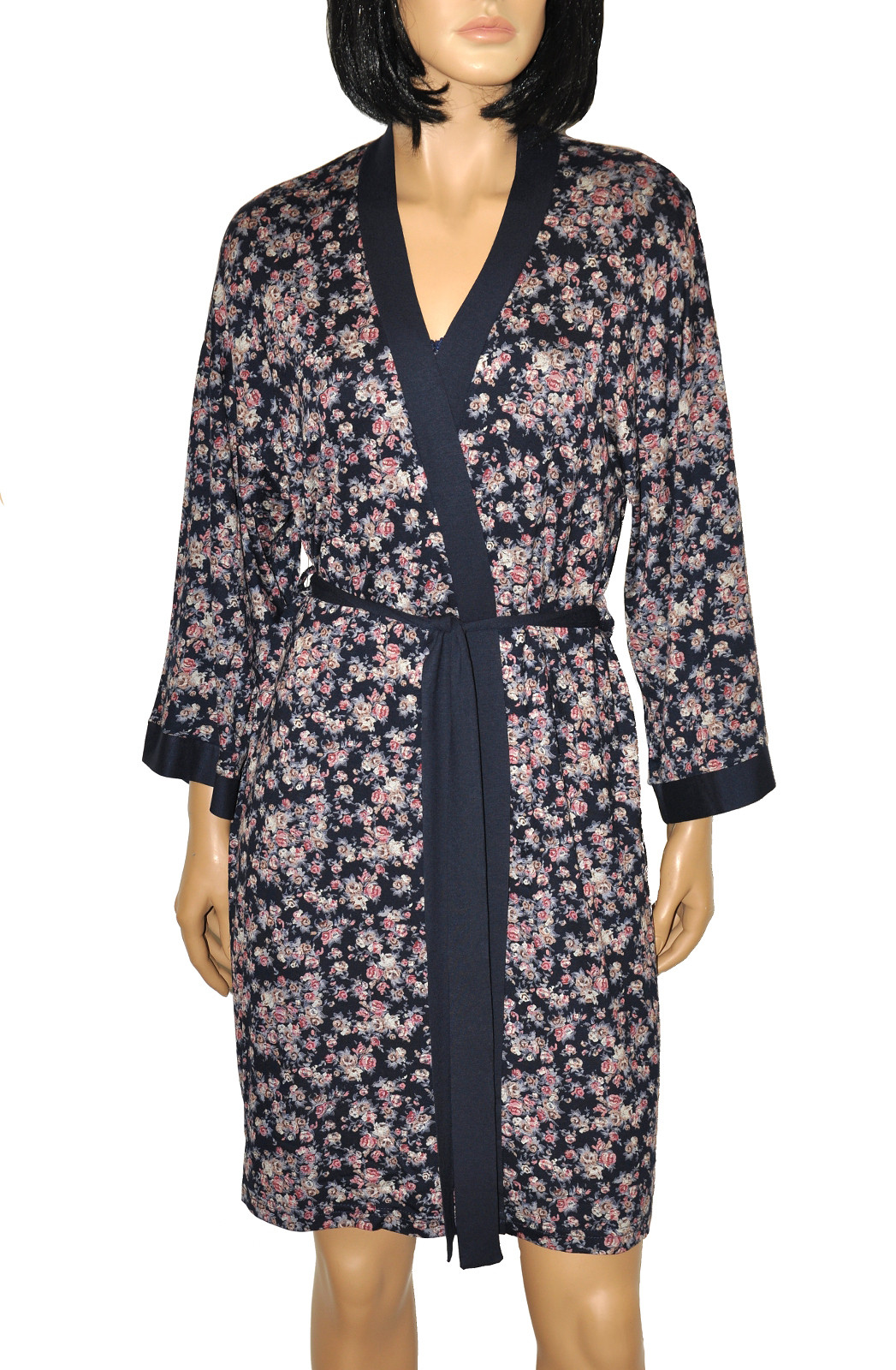 Tenký dámský župan s kimonovými rukávy. Župan je vyrobený ze vzorované viskózy. Model má na úrovni boků pohodlné kapsy a v pase se zavazuje. Složení: 94 % viskóza, 6 % elastan.