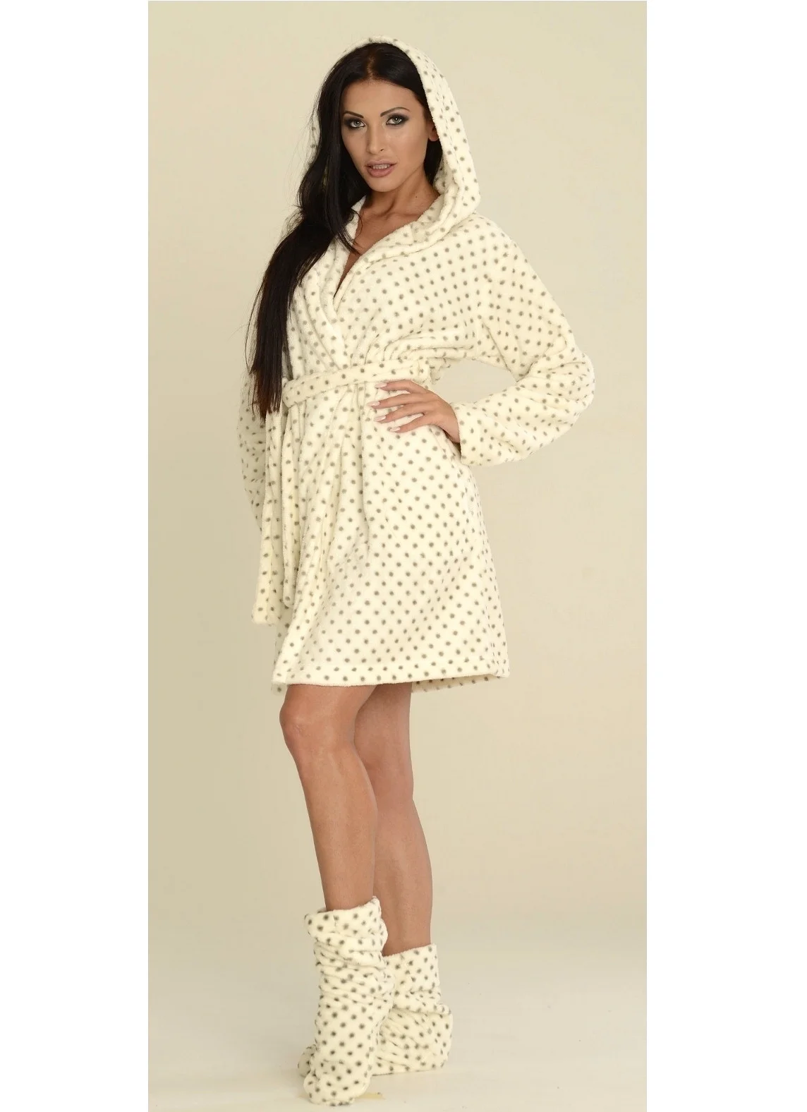 Krátký, puntíkovaný dámský župan s kapucí je vyrobený z příjemného materiálu typu soft v barvě ecru. Župan má vázání v pase a kapsy. Složení: 100% polyester