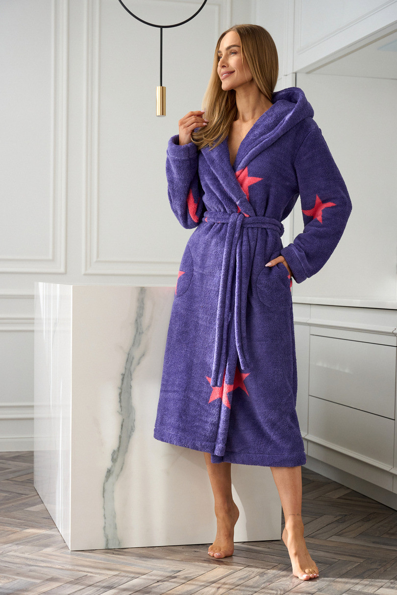 Szlafrok damski długi 2593 to idealne połączenie stylu, wygody i przyjemnego ciepła. Wykonany z miękkiej i otulającej dzianiny typu soft, doskonale sprawdzi się o każdej porze roku – zarówno po kąpieli, jak i podczas wieczornego relaksu w domu. Jego cechą charakterystyczną jest modny wzór w duże gwiazdy, który nadaje całości nowoczesnego, młodzieżowego charakteru. Szlafrok posiada podwójny, ocieplany kaptur, praktyczne kieszenie oraz jest wiązany w pasie – co pozwala na wygodne dopasowanie do sylwetki. Komfortowy krój i miękka faktura sprawią, że nie będziesz chciała go zdjąć!
