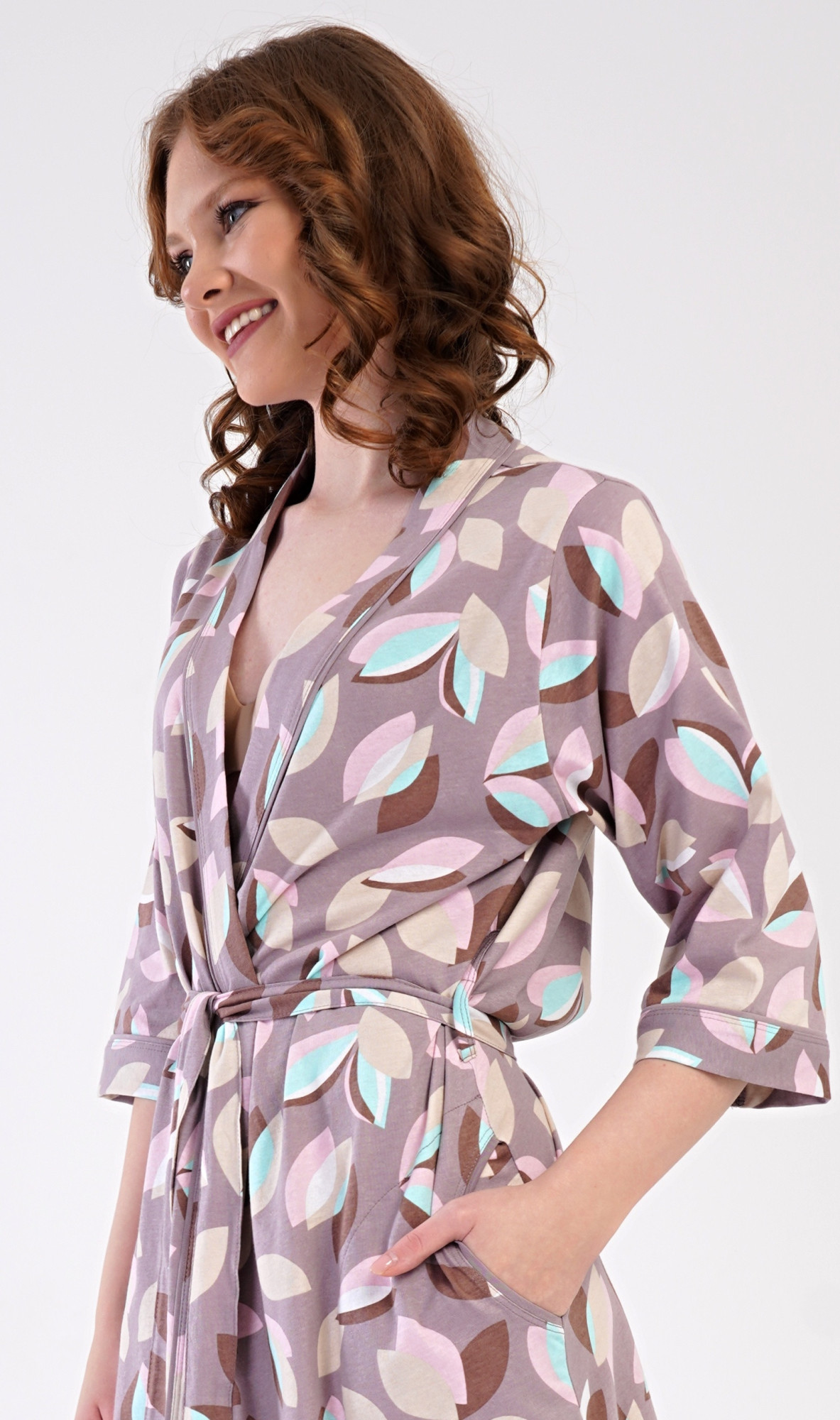 Dámský krátký bavlněný župan Klára. Dámský župánek v délce pod kolena je potišten pestrobarevnými listy. Župan má pásek ke stažení a praktické kapsy. Použitý bavlněný materiál je příjemný a poddajný na dotek, saje a oceníte ho i po koupeli.