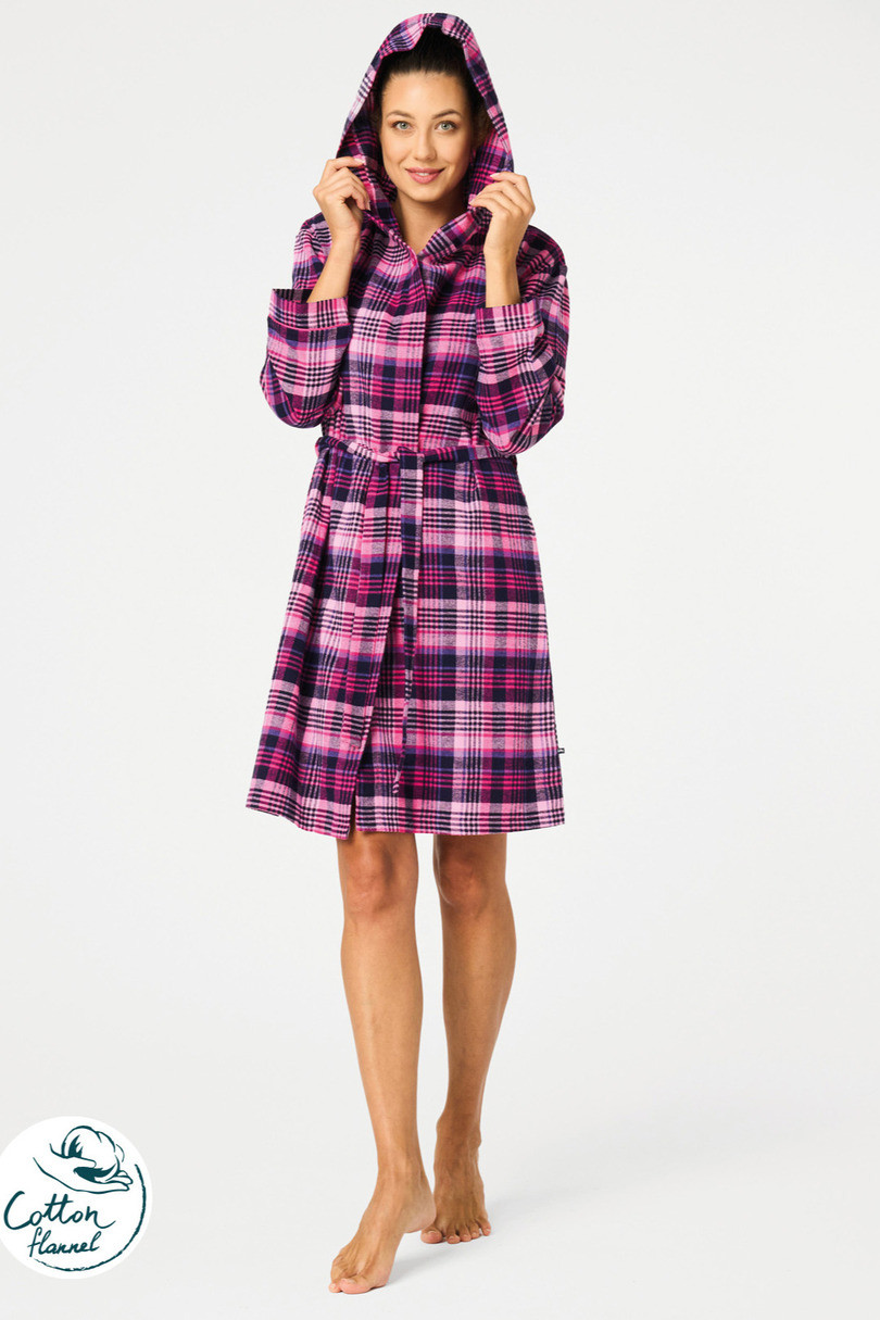 Szlafrok damski LGD 490 to połączenie ciepła, wygody i kobiecego stylu. Wykonany z wysokiej jakości bawełny flanelowej, jest wyjątkowo miękki i przyjemny w dotyku, a jednocześnie zapewnia doskonałą izolację cieplną w chłodniejsze dni. Klasyczny wzór w różowo-czarną kratę nadaje mu ponadczasowego uroku. Model posiada praktyczny kaptur chroniący przed chłodem, pasek do wiązania w talii oraz wygodne kieszenie, w których można ogrzać dłonie lub schować drobiazgi. Idealny do narzucenia po kąpieli, porannym prysznicu czy na relaksujący wieczór w domu. 100% Bawełna flanela