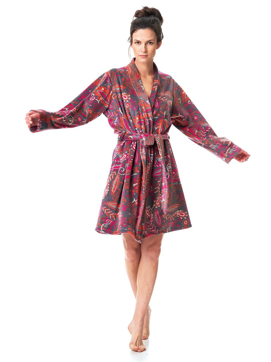 Dámský krátký župan - hřejivý, velmi měkký mikrofleece - barevný květinový potisk - dlouhý rukáv - zavázané v pase - kapsy na bocích - délka před kolenem Materiál složení: 95% polyester, 5% elastan