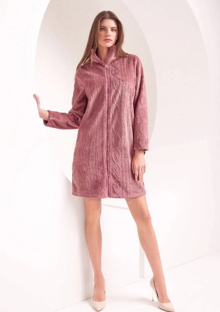 Dámský župan italské značky Lormar. Župan je dlouhý nad kolena, je celopropínací na zip. Po celé ploše županu je vyražený vzor. Rukávy jsou ukončené volně. Okolo krku je stojáček. Na bocích jsou zapuštěné kapsy. Materiálové složení: 100% polyester