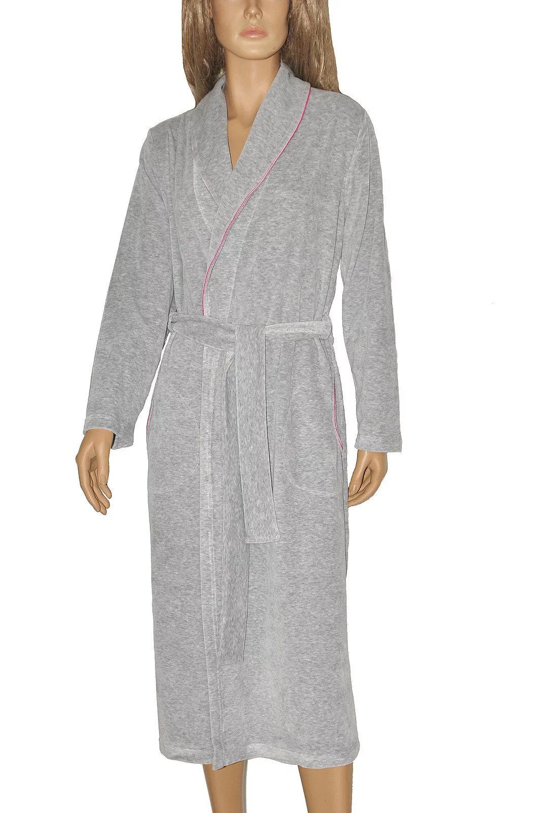 Dlouhý, pohodlný župan s šálovým límcem. Ušitý je z příjemného veluru. Má kapsy, vázání v pase a je obšitý kontrastními lemy. Složení: 80% bavlna, 20% polyamid