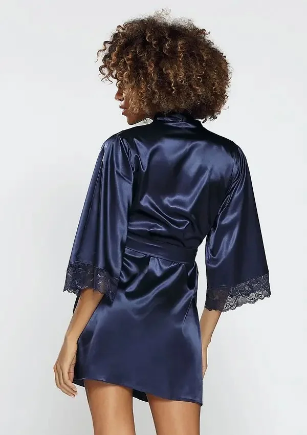 Dámský župánek, který je vyrobený z jemného saténu. Model má dlouhé rukávy a v pase se zavazuje. Manžety rukávů jsou ozdobené efektní krajkou s květinovým motivem. Složení: 100 % polyester.