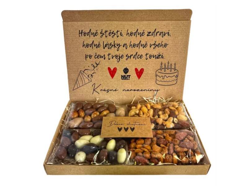 Dárková krabička je plná vynikajících ořechů. Kombinuje v sobě luxusní slané a sladké ořechy. Vnější rozměry krabičky: 24,5 x 16 x 2 80g Slaný párty mix 80g Směs mandlí v čokoládě BROWN 80g Mandle tří barev 80g Směs ořechů v medu a soli Směs kešu, arašídů a mandlí v medu a soli Složení: Arašídy 26 %, kešu 25 %, mandle 25%, cukr 18,5 %, med 3,5 % mořská sůl 2 %. Skladování: Skladujte v suchu při teplotě do 25°C. Po otevření ihned spotřebujte. Chraňte před přímým slunečním zářením. Alergeny: Výrobek může obsahovat stopy mléka a výrobky z nich. Země původu: Holandsko Směs mandlí v čokoládě BROWN Skladování: Skladujte na temném, chladném a suchém místě Směs namíchána v: České republice Mandle v karamelu Složení: MANDLE jádra pražená 20%, poleva s karamelovou příchutí 79% {cukr, částečně ztužený rostlinný tuk [palmový, SÓJOVÝ (plně rafinovaný)], sušená SYROVÁTKA (MLÉKO), kakaový prášek, sušené odstředěné MLÉKO, emulgátor: slunečnicový lecitin; aroma,přírodní vanilkové aroma}, lešticí směs (tapiokový škrob, cukr, lešticí látka: šelak; kokosový olej, kyselina: kyselina citronová, konzervant: kyselina sorbová). Mandle v mléčné čokoládě Složení: mléčná čokoláda 75% (cukr, kakaové máslo, sušené plnotučné MLÉKO, kakaová hmota, sušená SYROVÁTKA (MLÉKO), LAKTÓZA, SOJOVÝ lecitin, přírodní vanilkové aroma), MANDLE jádra 25%, leštidlo: arabská guma. Mandle tiramisu Složení: MANDLE 31%, tiramisu poleva 69% (cukr, rostlinný olej palmový, SYROVÁTKA (MLÉKO),rýžovámouka, slunečnicový lecitin, arabská guma, šelak, příchuť tiramisu, kakaová hmota, kakaové máslo). SLANÝ párty MIX Směs suchých skořápkových plodů pražených solenýchSložení: MANDLE jádra pražená solená 35% (MANDLE jádra loupaná, rostlinné oleje v různém poměru (slunečnicový/palmový), sůl (USA)), KEŠU jádra pražená solená 35%(KEŠU jádra, rostlinné oleje v různém poměru (slunečnicový/palmový), sůl (Indie)), MANDLE jádra pražená uzená 30% (MANDLE jádra, rostlinné oleje v různém poměru (slunečnicový/palmový), směs koření, USA)). Alergeny: vyznačeny ve složení velkým písmem. Výrobek může obsahovat stopy arašídů, jiných skořápkových plodů oxidu siřičitého nebo sezamu. Mandle TŘÍ BAREV Složení: Mandle v hořké čokoládě Složení: hořká čokoláda 75% (cukr, kakaová hmota, kakaové máslo, SOJOVÝ lecitin, přírodní vanilkové aroma), MANDLE jádra 25%, leštidlo: arabská guma),Mandle v mléčné čokoládě Složení: mléčná čokoláda 75% (cukr, kakaové máslo, sušené plnotučné MLÉKO, kakaová hmota, sušená SYROVÁTKA (MLÉKO), LAKTÓZA, SOJOVÝ lecitin, přírodní vanilkové aroma), MANDLE jádra 25%, leštidlo: arabská guma),Mandle v bílé čokoládě Složení: bílá čokoláda 75% (cukr, kakaové máslo,sušené plnotučné MLÉKO,LAKTÓZA, sušené odstředěné MLÉKO, SOJOVÝ lecitin, přírodní vanilkové aroma), MANDLE JÁDRA 25%, leštidlo: arabská guma).