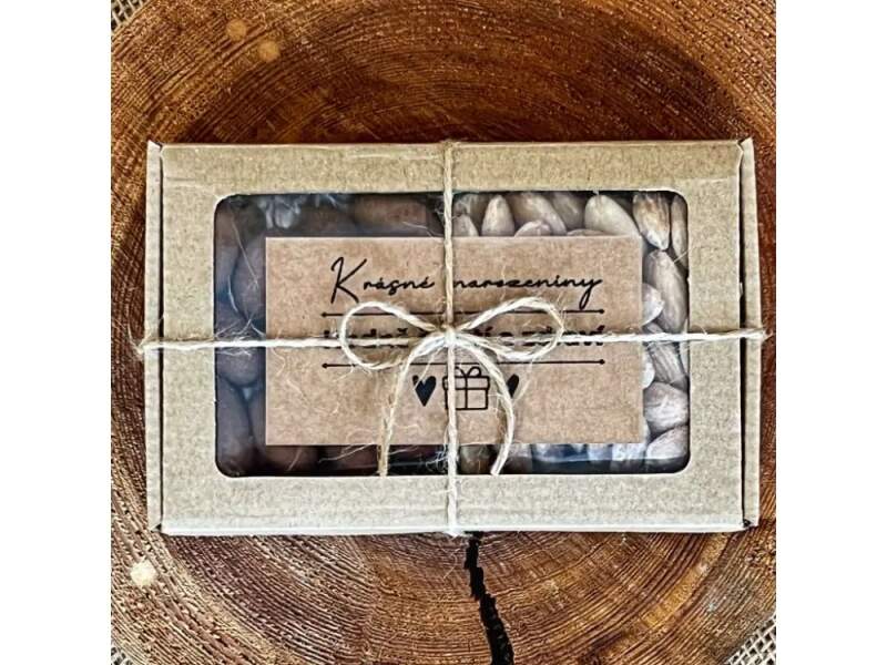Originální ořechová krabička k narozeninám plná oříšků. Sladko slaná kombinace se hodí téměř pro každého. Krabička obsahuje Solené mandle a Mandle v mléčné čokoládě se skořicí 2x50g Vnější rozměry krabičky: 140X90mm Mandle solené Skořápkové plodySložení: jádra MANDLÍ 100%, slunečnicový olej, himalájská sůlSkladování: Skladujte na temném, chladném a suchém místěMinimální trvanlivost: 6 - 10 měsícůZemě původu: USA (vyrobeno v ČR) Může obsahovat stopy lepku, ostatních skořápkových plodů, arašídů, sóji a sezamu. Alergeny vyznačeny ve složení velkým písmem. Mandle v mléčné čokoládě a skořici Skořápkové plody dražovanéSložení: MANDLE jádra pražená 18%, mléčná čokoláda min. 71% (cukr, kakaové máslo, sušené plnotučné MLÉKO, kakaová hmota, rostlinné tuky (palmový olej, olej z máslovníku, olej z jader manga), MLÉČNÝ tuk, sušená SYROVÁTKA (MLÉKO), laktóza (MLÉKO), emulgátory: slunečnicový lecitin a E476, aroma), cukr 3%, obsah kakaové sušiny min. 25%, skořiceSkladování: Skladujte na temném, chladném a suchém místěMinimální trvanlivost: 12 měsícůZemě původu: USA Může obsahovat stopy lepku, ostatních skořápkových plodů, arašídů, sóji a sezamu. Alergeny vyznačeny ve složení velkým písmem. Energetická hodnota 2329kj /560kcal Tuky 37g z toho nasycené mastné kyseliny 17g Sacharidy 52g z toho cukry 44g Bílkoviny 9g Sůl 0,08g