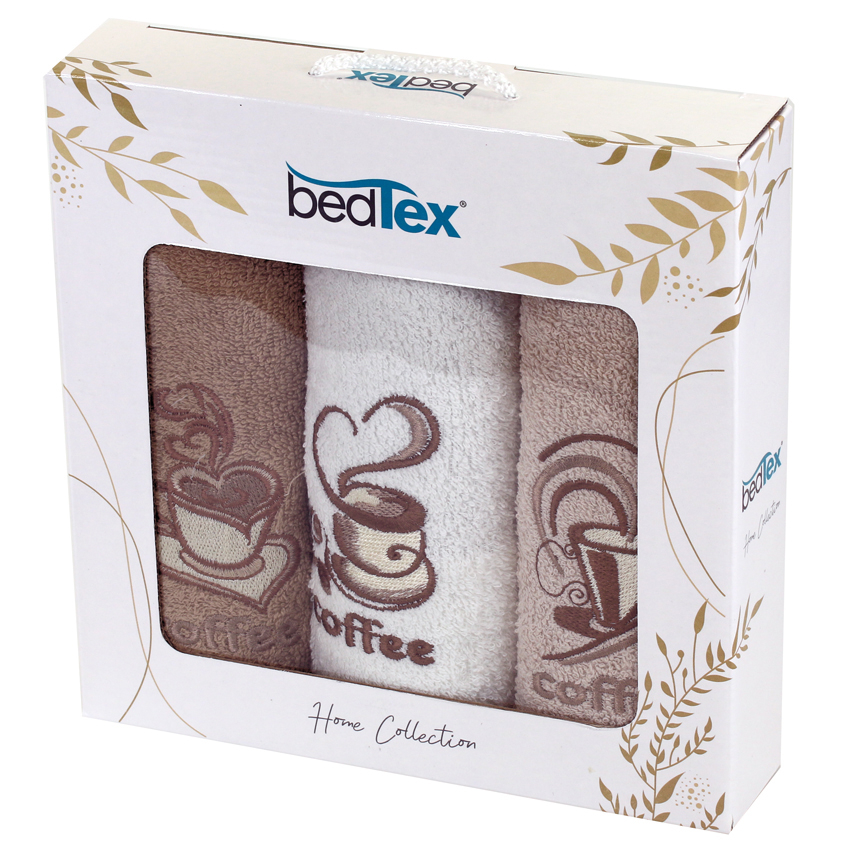 Dárková sada froté ručníčků 3 ks Čas na kávu Dárková sada kuchyňských froté ručníčků, je vyrobena ze 100% bavlnyRučníky jsou ve třech barvách a to bílé, béžové a světle hnědé, s vyšitými kávovými hrníčky, které jsou "plné kávy, cuppuccina a laté" :))))Ručník je vyroben ze smyčkového froté s gramáží 400 g/m²Každý ručníček s kávovými hrníčky má rozměry 30x50 cmRučníčky najdou své využití hlavně v kuchyni, kde budou díky svému dekoru krásně laditV naší nabídce najdete nejen ručníčky, ale také vaflové utěrkyDárková sada Čas na kávu je vyrobena v TureckuPokud budete chtít potěšit své nejbližší, nebo přátele, věřte, že právě tato sada pro ně bude krásným dárkemVYNIKAJÍCÍ POMĚR KVALITY, DESIGNU A CENY Ručníky perte podle symbolů uvedených na obaleNepoužívejte prací prostředky s obsahem bělících a rozjasňujících substancí Odstíny barev obrázků s mohou barevně lišit, v závislosti na nastavení vašeho monitoru