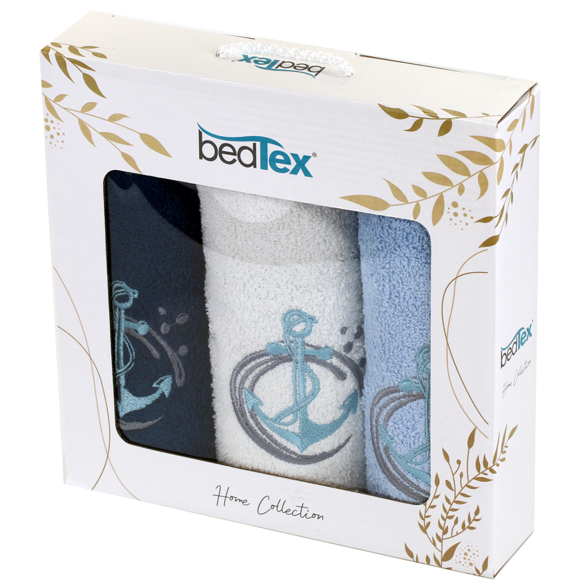 Dárková sada kuchyňských ručníčků 3 Ks Kotvy Dárková sada kuchyňských froté ručníčků, je vyrobena ze 100% bavlnyRučníky jsou ve třech barvách a to bílé, světle modré a tmavě modré s vyšitou kotvouRučník je vyroben ze smyčkového froté s gramáží 400 g/m²Každý ručníček s kotvou má rozměry 30x50 cmRučníčky najdou své využití nejen v kuchyni, ale jsou vhodné i do koupelen, třeba hned k umyvadluV naší nabídce najdete nejen ručníčky, ale také vaflové utěrkyDárková sada Kotvy je vyrobena v TureckuPokud budete chtít potěšit své nejbližší, nebo přátele, věřte, že právě tato sada pro ně bude krásným dárkemVYNIKAJÍCÍ POMĚR KVALITY, DESIGNU A CENY Ručníky perte podle symbolů uvedených na obaleNepoužívejte prací prostředky s obsahem bělících a rozjasňujících substancí Odstíny barev obrázků s mohou barevně lišit, v závislosti na nastavení vašeho monitoru