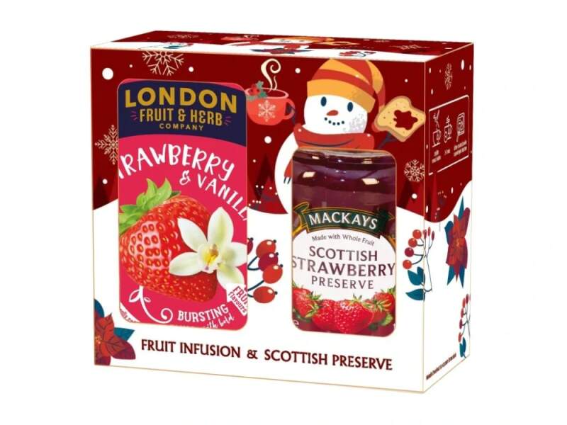 Vánoční sada se sněhulákem obsahuje ovocný čaj Jahoda s vanilkou a skotský džem Jahoda Mackays. Složení DŽEM Jahoda 340g: Cukr, skotské jahody, želírovací činidlo: pektin, regulátor kyselosti: kyselina citrónová.Obsah ovoce 35g / 100g. Obsah cukru 65g / 100g. Výživové údaje ve 100g:Energetická hodnota 1149 kJ/270kcalTuk 0g (z toho nasycené mastné kyseliny 0g)Sacharidy 67,2g (z toho cukry 66,9g)Bílkoviny 0,3gSůl 0g Složení ČAJ Jahoda s vanilkou, 20 sáčků: Ibišek, jablečná drť, listy sladkého ostružiníku, regulátory kyselosti (kyselina vinná, kyselina citronová), aroma (6,5 %), kořen lékořice, jahodová drť (1 %), vanilkový prášek (0,5 %).
