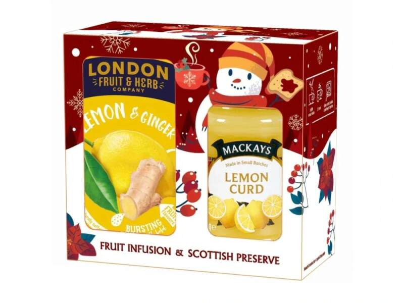 Vánoční sada se sněhulákem obsahuje ovocný čaj London Herb Citron se zázvorm a skotskou zavařeninu Mackays Lemon curd (citrónový krém) Složení ZAVAŘENINA Citrónový krém 340g:Cukr, celá VEJCE (pasterizovaná), máslo(z MLÉKA), modifikovaný kukuřičný škrob, citrónová šťáva z koncentrátu (4%), ovocný pektin, regulátor kyselosti : kyselina citrónová, citrónový olej, emulgátor: E475. Výživové údaje ve 100g:Energetická hodnota 1518 kJ/359kcalTuk 5,7g (z toho nasycené mastné kyseliny 3,3g)Sacharidy 75g (z toho cukry 69g)Bílkoviny 1,4gSůl 0,06gSložení ČAJ Citrón se zázvorem, 20 sáčků:Jablečná drť, zázvor (25%), regulátor kyselosti (kyselina citronová), přírodní aroma, pražený kořen čekanky, listy sladkého ostružiníku, citronová kůra (1%), lípa stříbrná, citronová tráva.