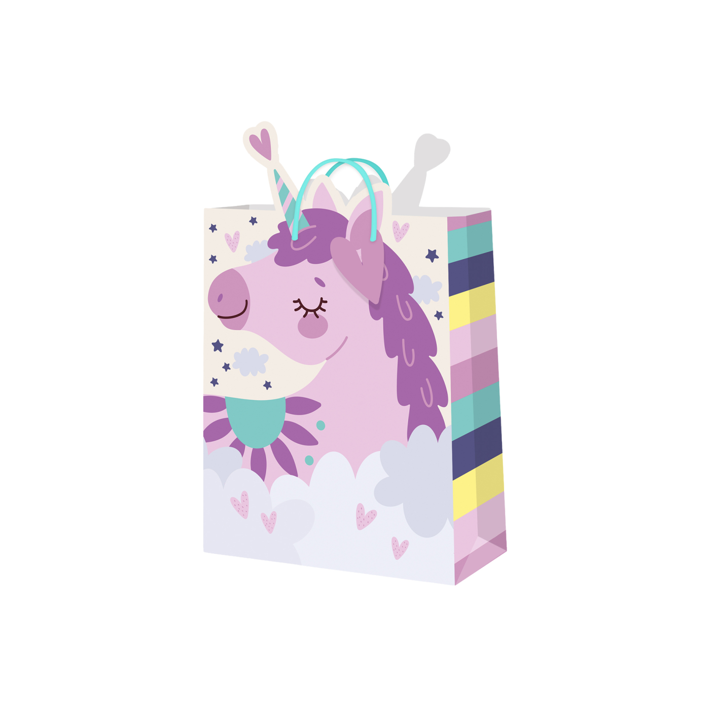 Roztomilá papírová dárková taška s výřezem nese motiv růžovo-fialového jednorožce. Rozměry: 17,8 × 9,8 × 22,9 cm (šířka × hloubka × výška)