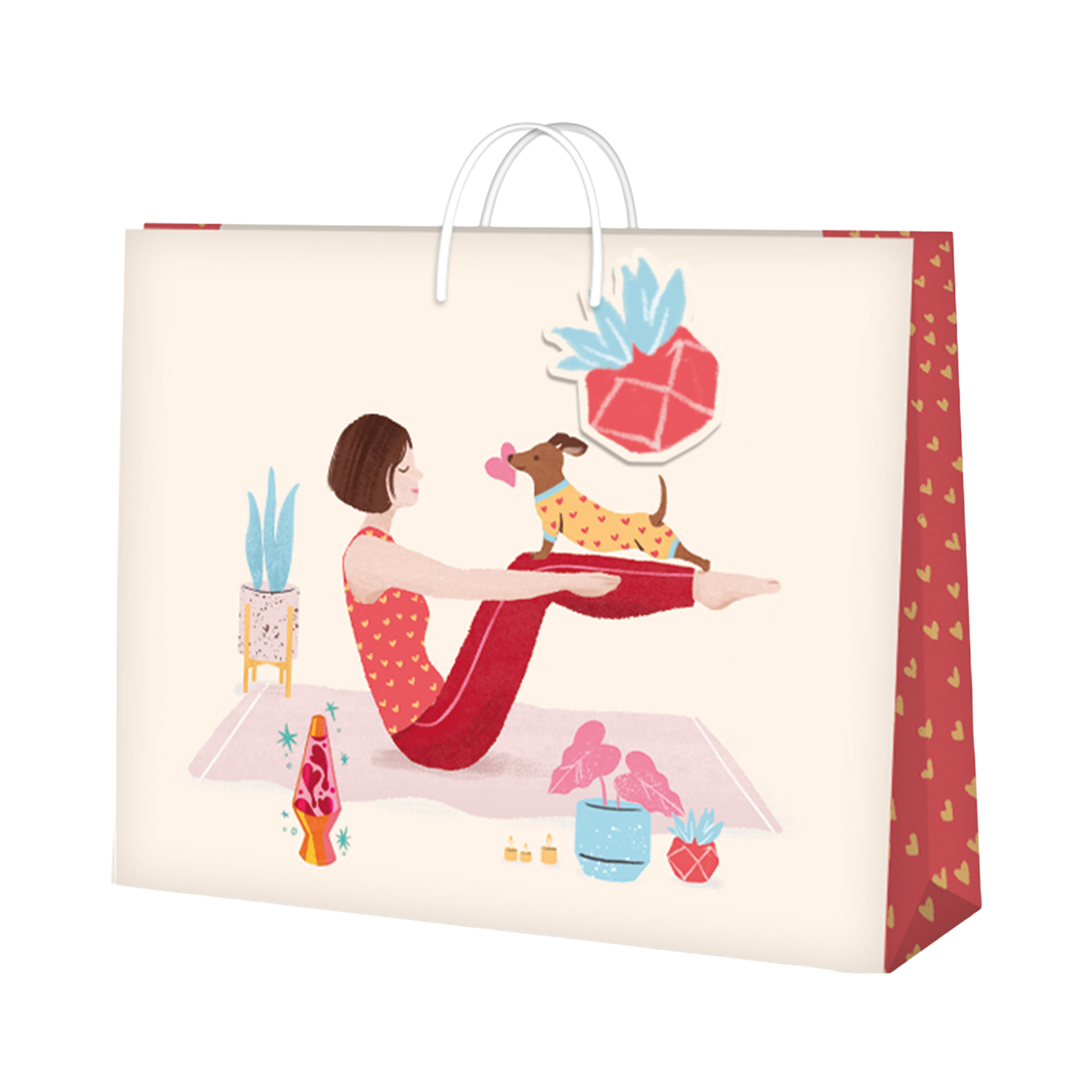Originální papírová dárková taška s motivem ženy, která cvičí jógu se svým pejskem. Taška je netradičně orientovaná na šířku. Rozměry: 32,4 × 12,7 × 26 cm (šířka × hloubka × výška)