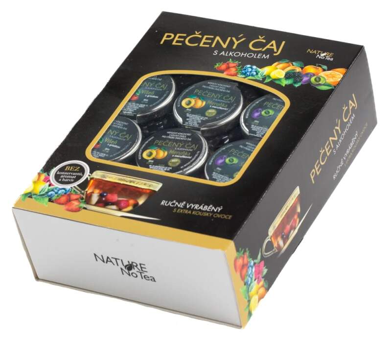 Stylové dárkové balení pečených čajů s alkoholem Sada obsahuje 12 jednoporcových balení 60ml. Možné druhy čajů Aloe Vera se zázvorem a tequilou Černý rybíz s karmamomem a ginem Jablko se skořicí a tuzemákem Malina se skořicí a vodkou Meruňka se skořicí a meruňkovicí Ostružina s kardamomem a vodkou Pomeranč se skořicí a tuzemákem Švestka s badyánem a slivovicí Višeň s kardamomem a griotkou V každém balení náhodný výběr druhů.