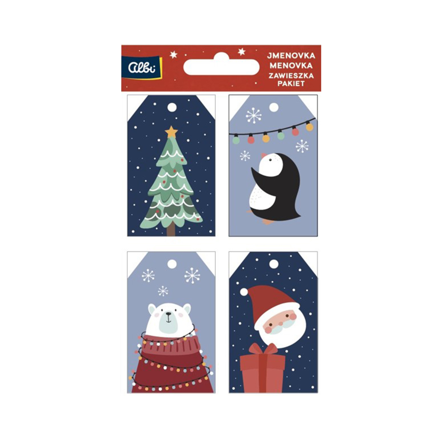 Balení 12 kusů modrých papírových jmenovek na dárek s dětskými vánočními motivy. Rozměry dárkových jmenovek: 8 × 5 cm