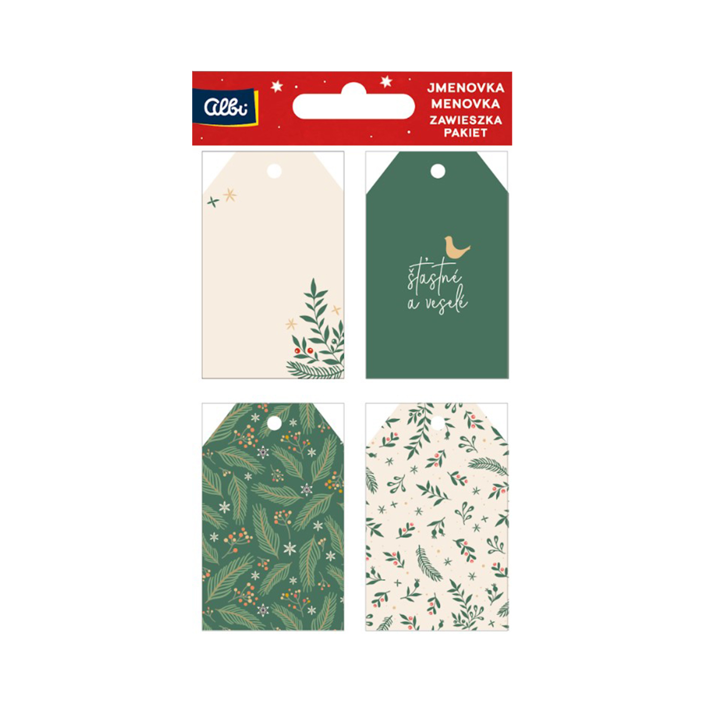 Balení 12 kusů decentních papírových jmenovek na dárek s vánočním motivem větviček a nápisem Šťastné a veselé. Rozměry dárkových jmenovek: 8 × 5 cm