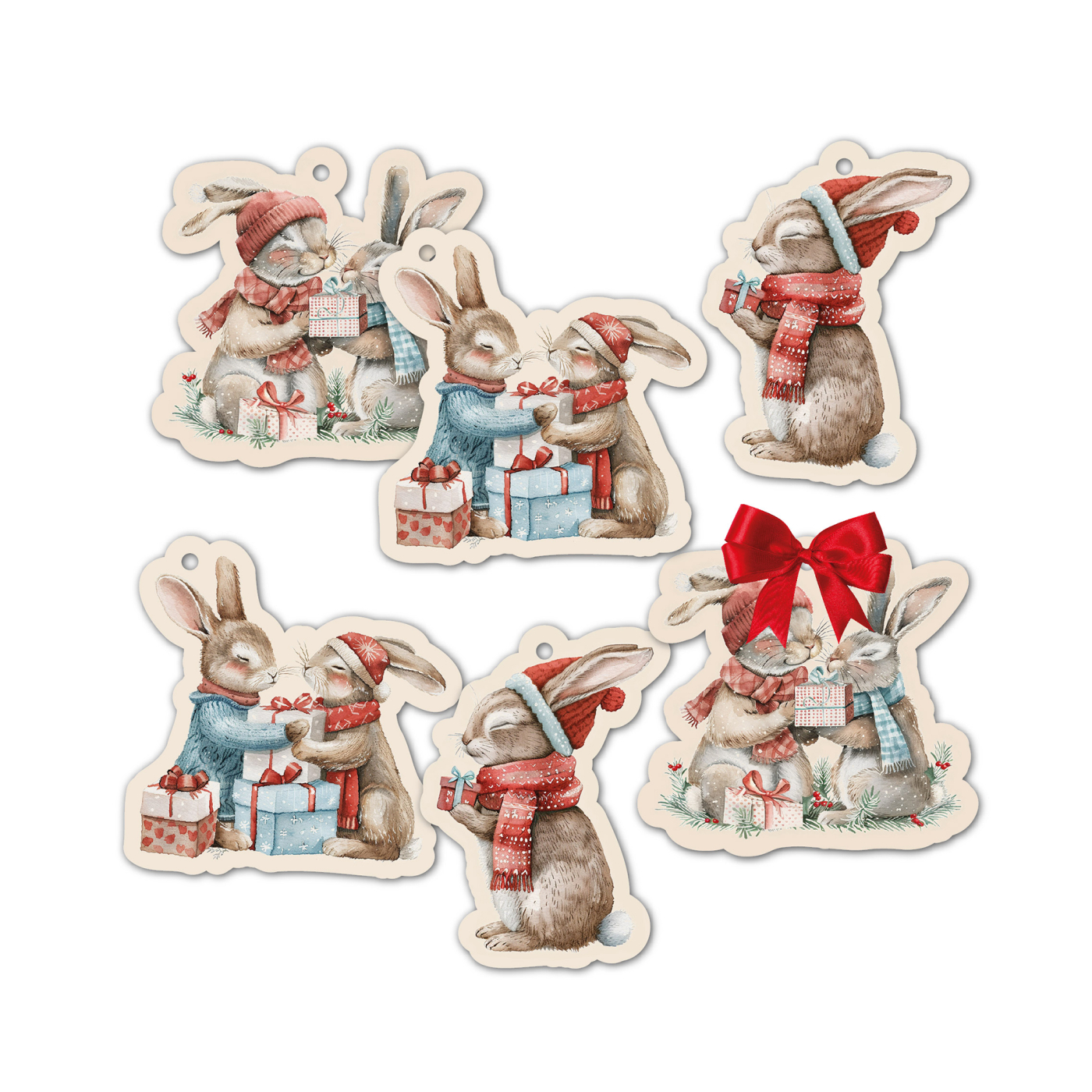 Balení roztomilých papírových jmenovek na dárek s motivem vánočních zajíčků v čepicích a šálách. Průměr jmenovky: cca 10 cm