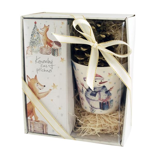 Dárkový balíček Kouzelný čas příchází v krásném zimním motivu s liškou Obsah balení aromatizovaný ovocný čaj 50 g hrnek 0,3l se sněhulákem a zvířátky dekorace pozlacená šiška Rozměr: 160x190x90 mm