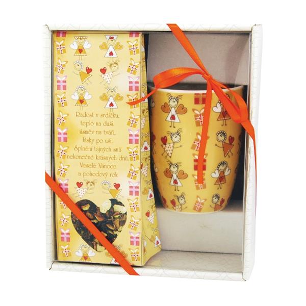 Krásný dárkový balíček s motivem Andílků. Balíček obsahuje porcelánový hrneček 0,34l vánoční ovocný čaj 50g v dárkové krabičce. Text: Radost v srdíčku, teplo na duši, úsměv na tváři, lásky po uši. Splnění tajných snů nekonečně krásných dnů. Veselé Vánoce a pohodový rok. Rozměr: 160x190x90mm